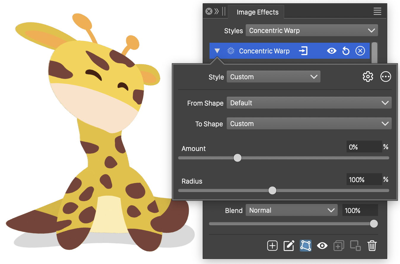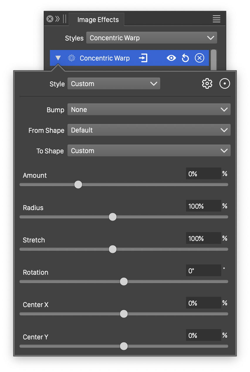 button from the Image Effects panel, activates the image effect tool used to interactively edit the concentric warp distortion attributes.
