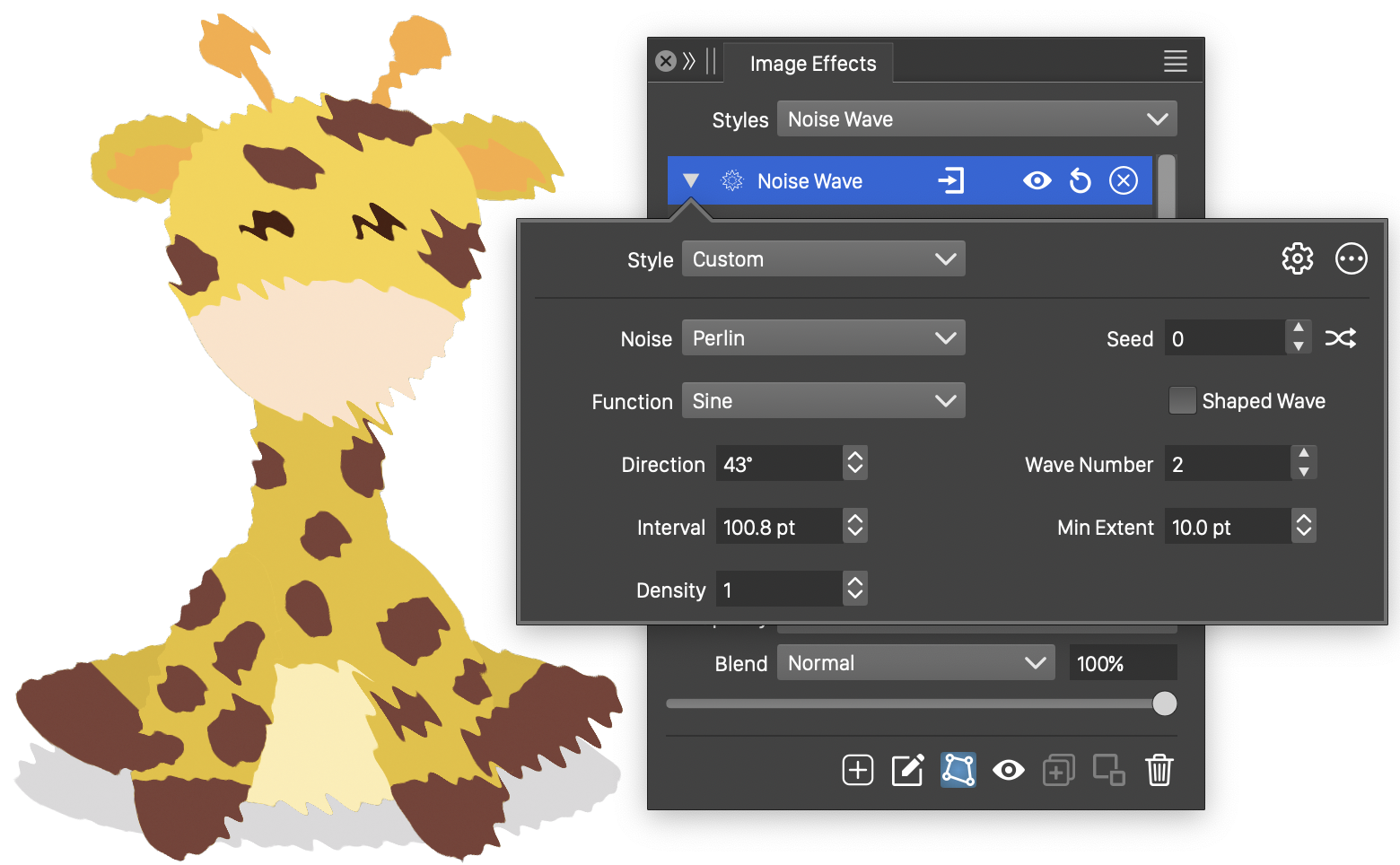 Interactive editing of the noise wave distortion is done by dragging the handles to change an attribute value:
