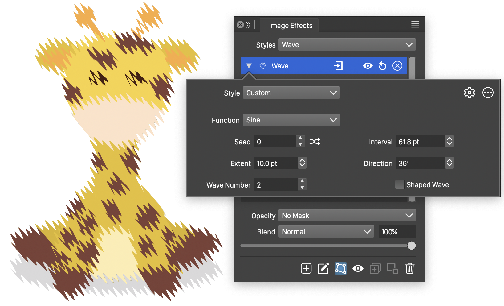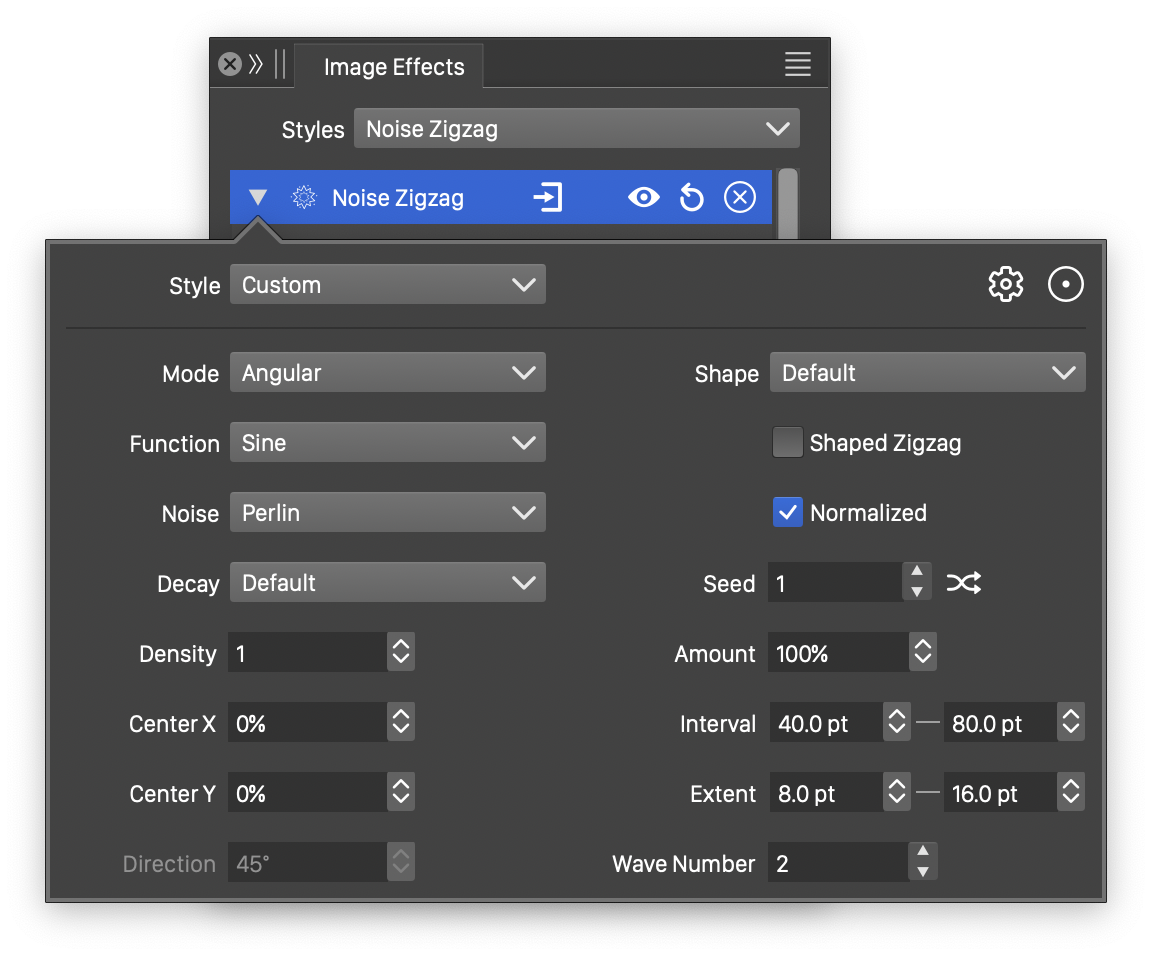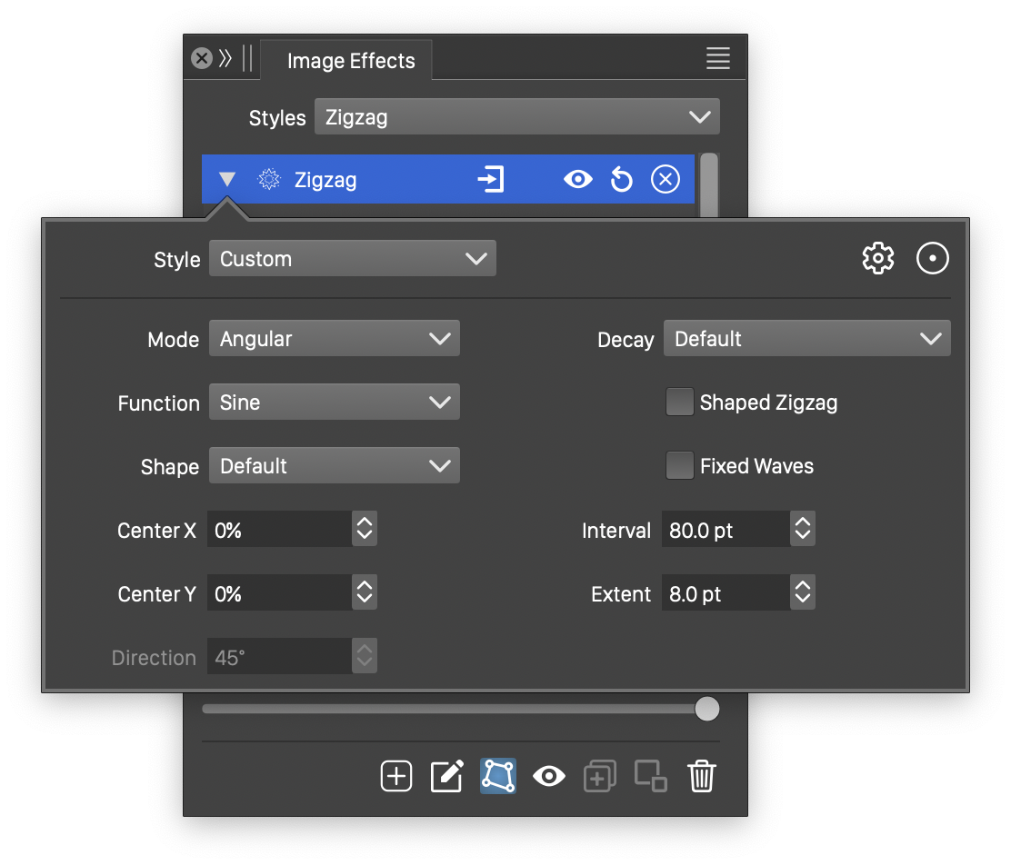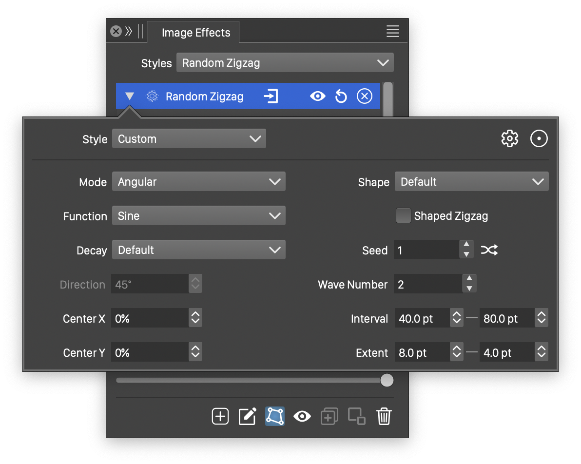 image effect editor tool. - Shaped Zigzag - Enable or disable the use of a shape (instead of a function) to control the zigzag distortion. When enabled, the Shape field is used to select a shape preset or style. When disabled, the Function field is used to control the jaggedness.