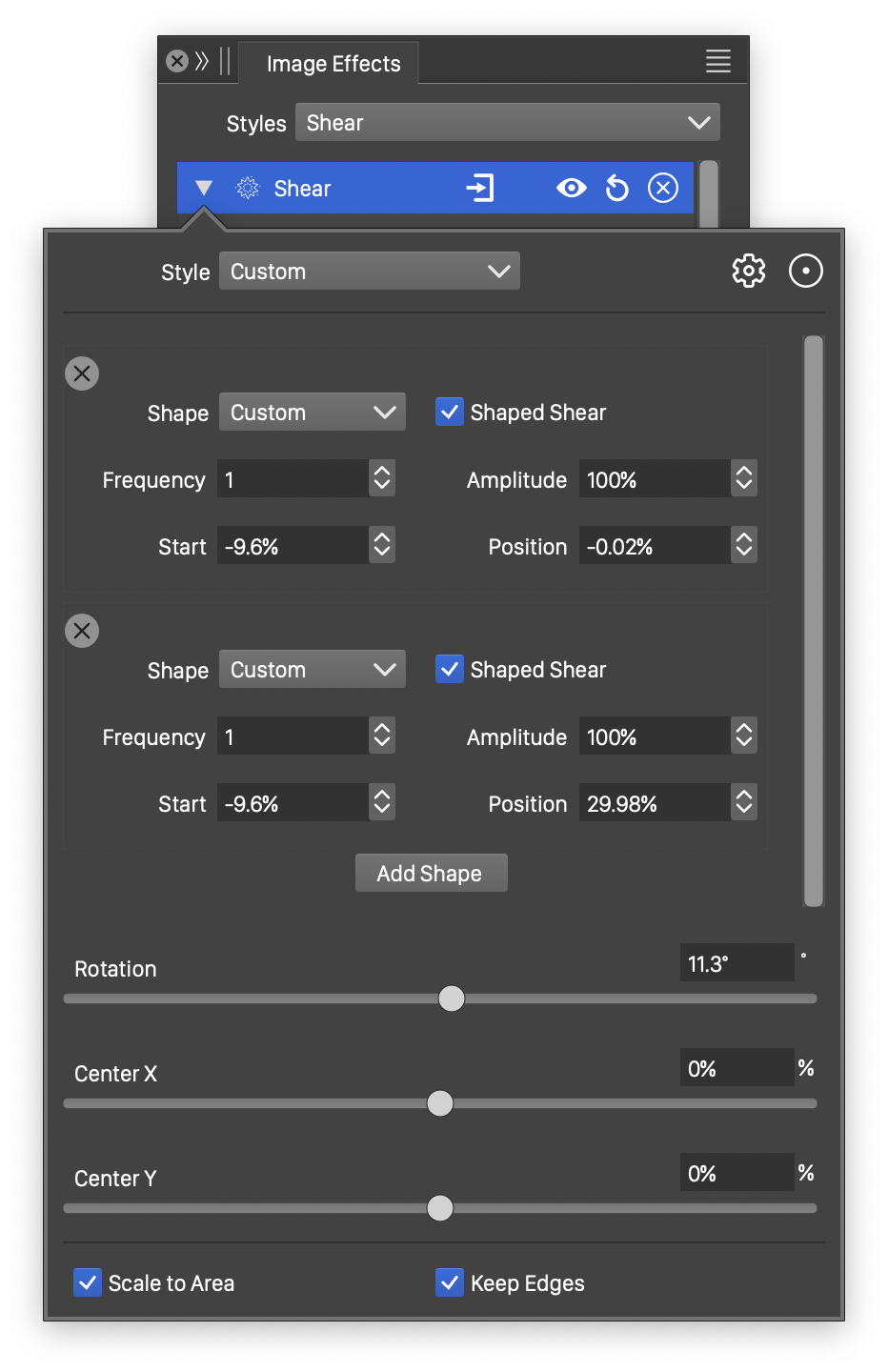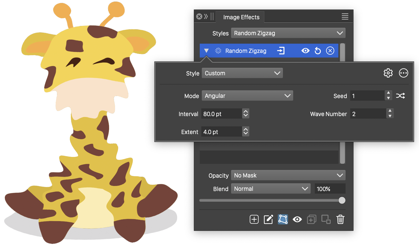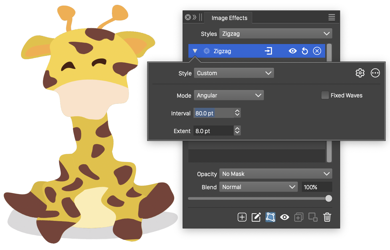 image effect editor tool. - Shaped Zigzag - Enable or disable the use of a shape (instead of a function) to control the zigzag distortion. When enabled, the Shape field is used to select a shape preset or style. When disabled, the Function field is used to control the jaggedness.