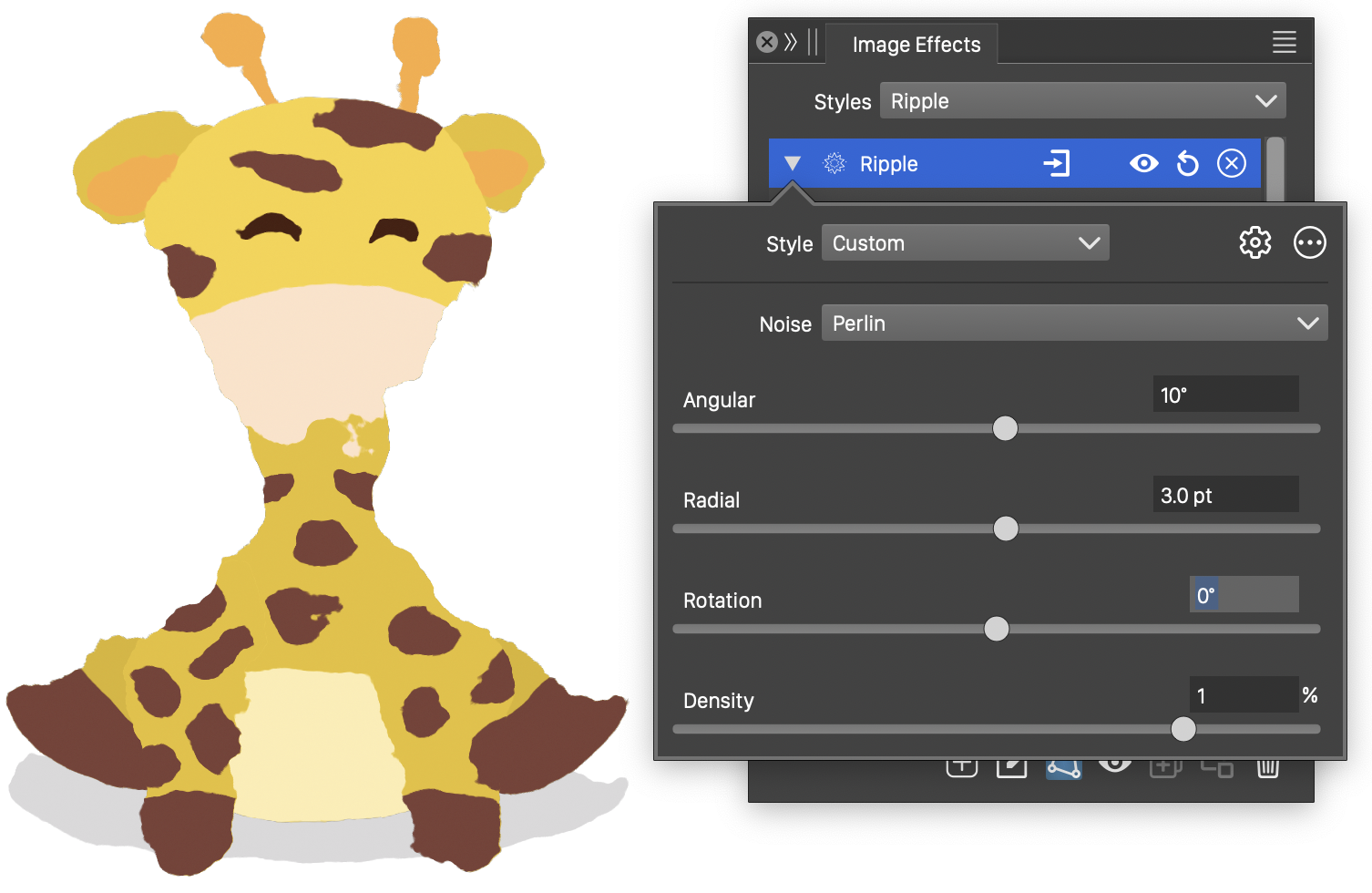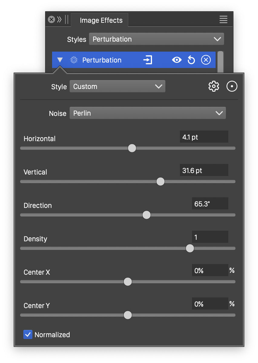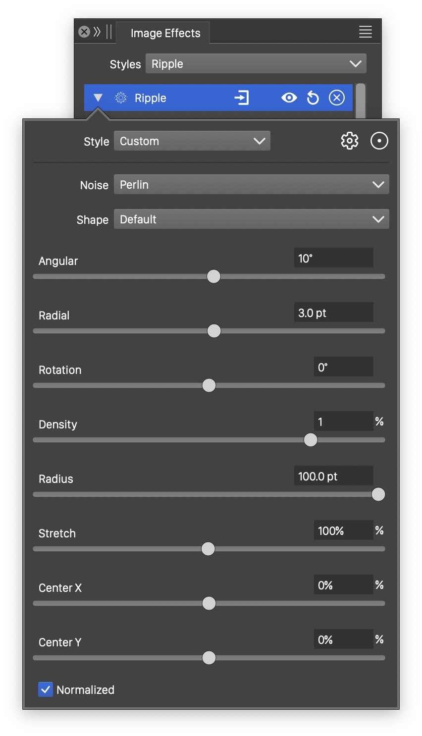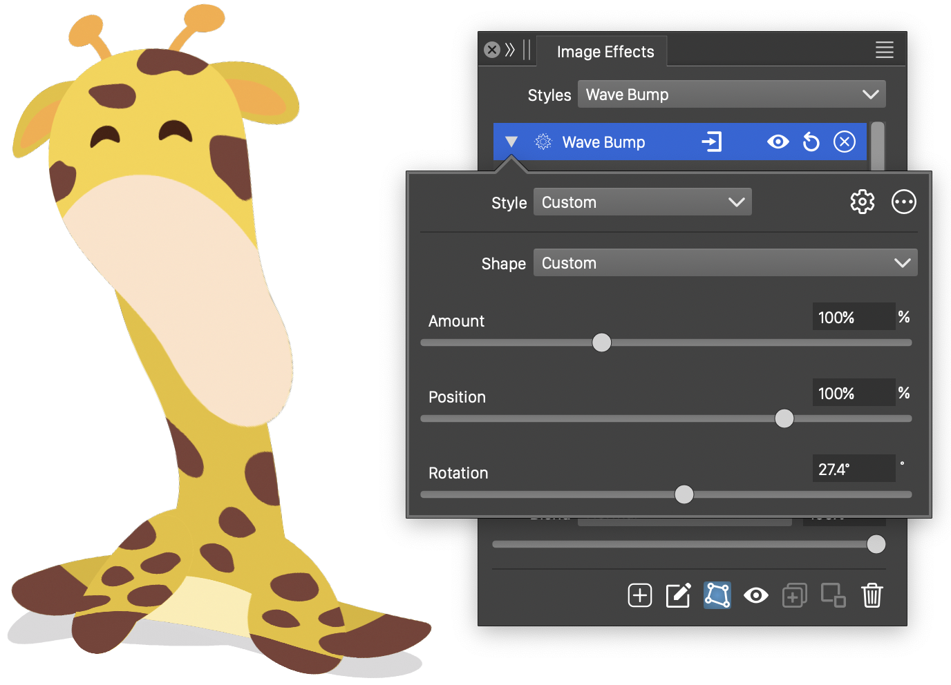 For most of these distortion effects, the interactive image effect editor can be used to adjust the common attributes visually in the canvas, selected with the primary