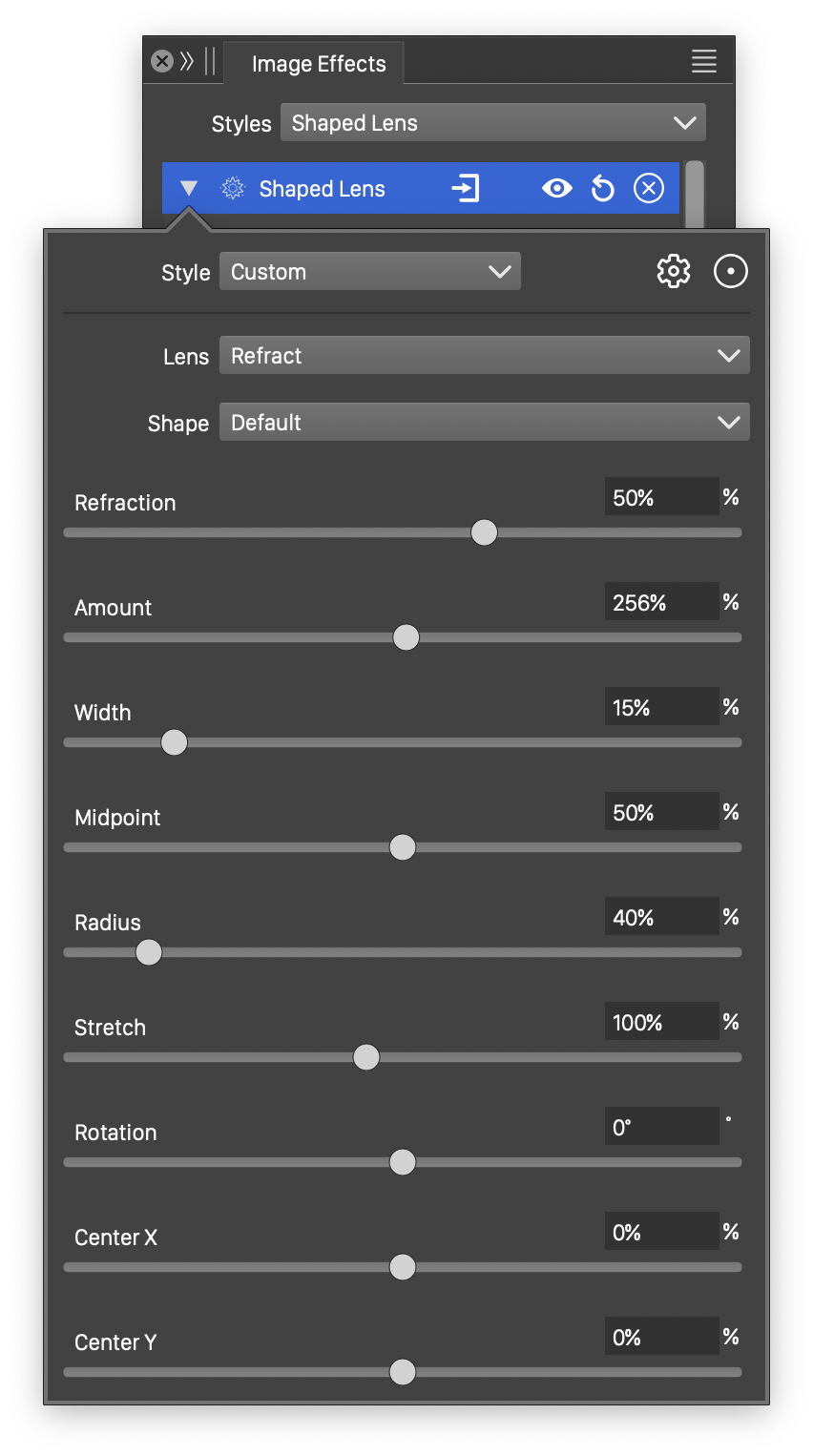 button in the icon section of the panel. - Amount - Edit the lensing amount.