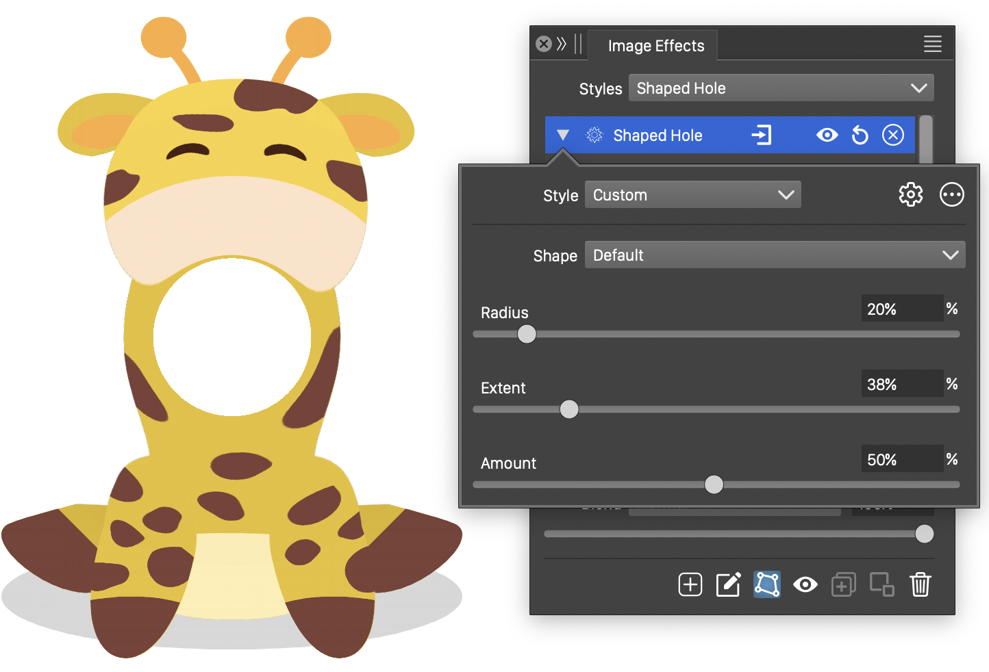 image effect tool from the icon section of the panel. When the secondary image effect tool is active, the hole shape nodes are shown and can be adjusted using regular path editing commands.