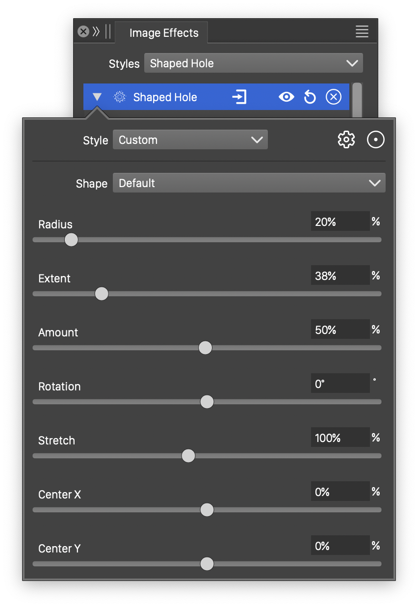 button from the Image Effects panel, activates the image effect tool used to interactively edit the hole distortion attributes.