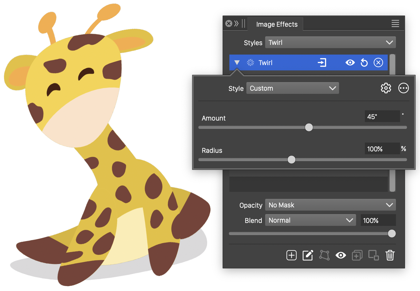 - Amount - Set the amount of twirl distortion. This will be the largest rotation angle used at the center of the twirl.