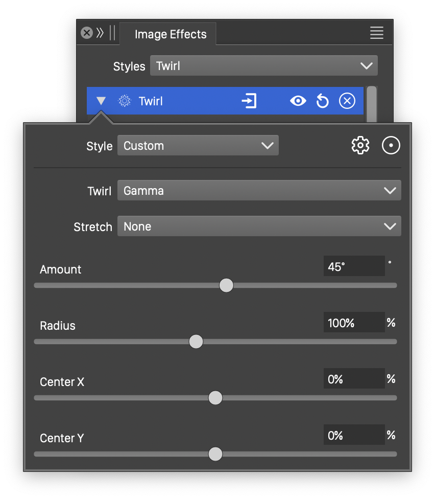 - Center X and Center Y - Set the center of the twirl distortion region, relative to the object frame. The center can also be adjusted visually using the primary