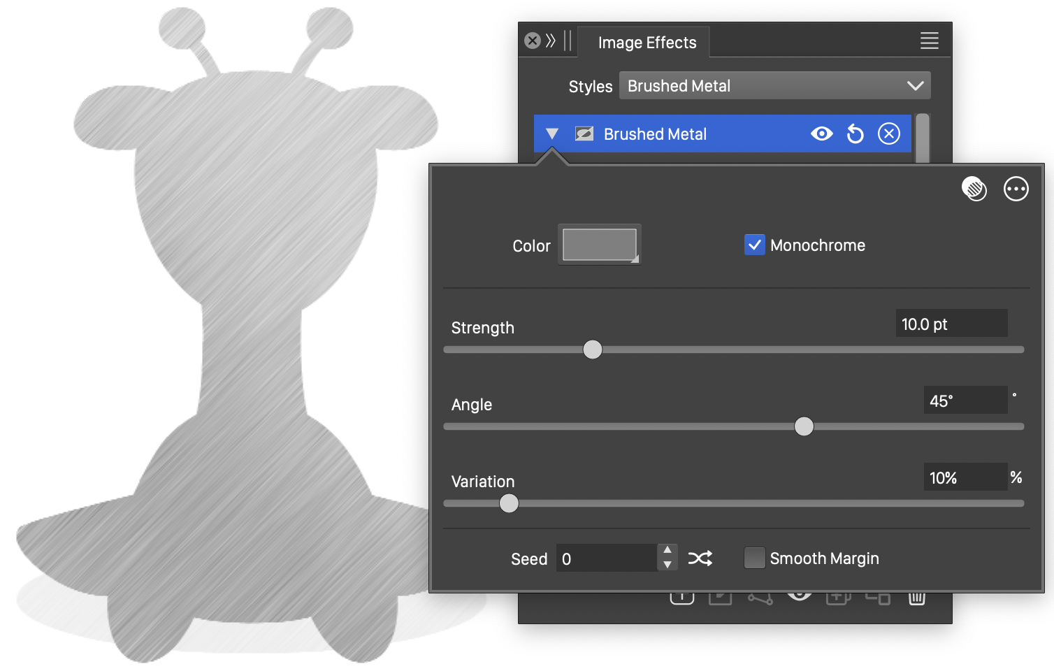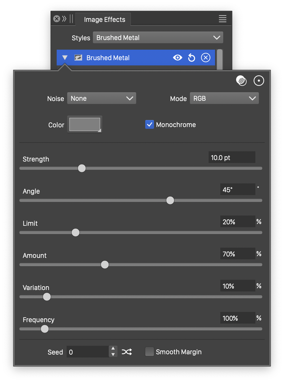button can be used to pick random seed values. - Smooth Margin - Enable or disable a smooth halo around the margin of the generated brush metal effect.