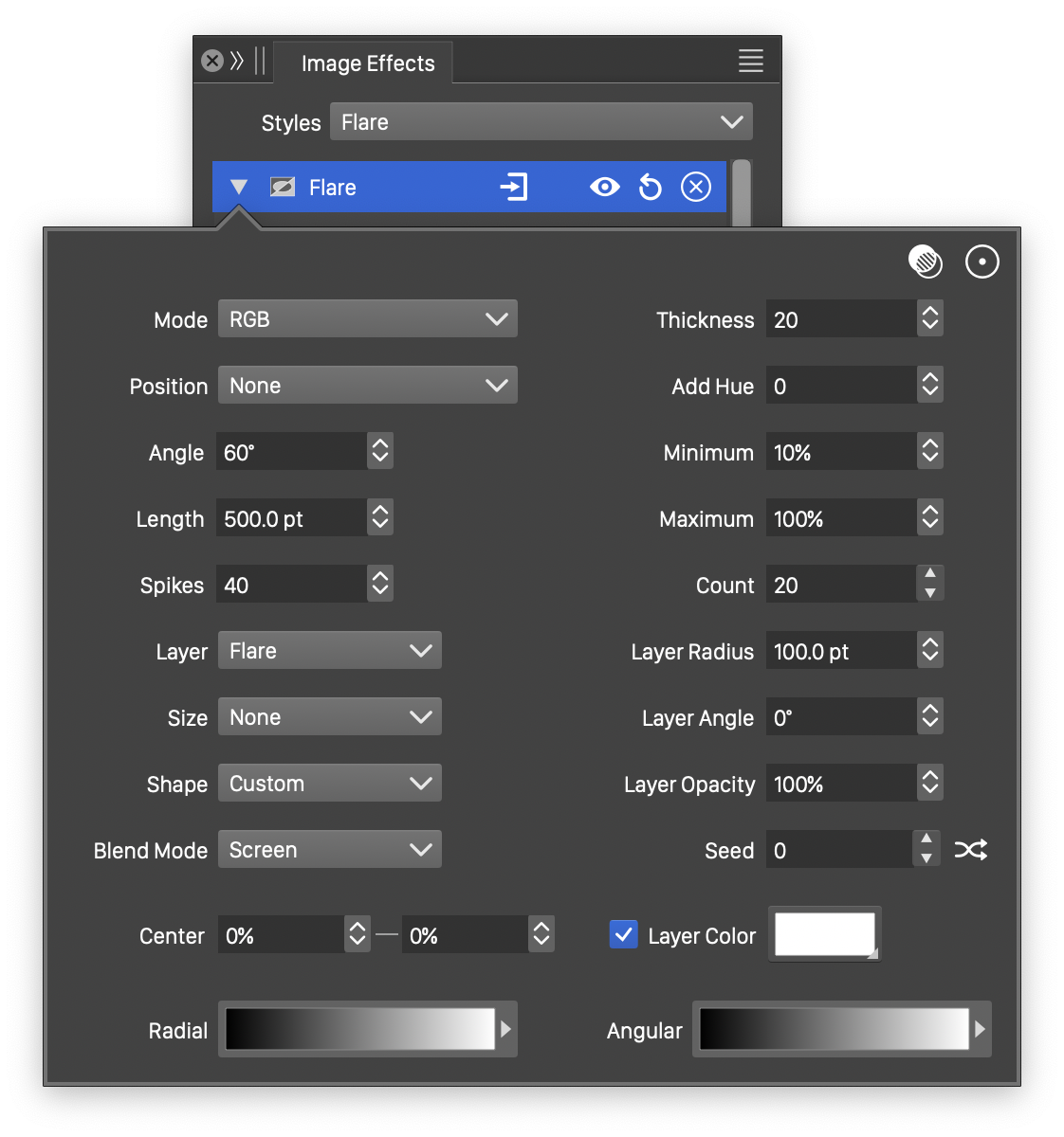 - Angular - Select a gradient color style or preset, used to color a flare layer in the direction around a glow center.
