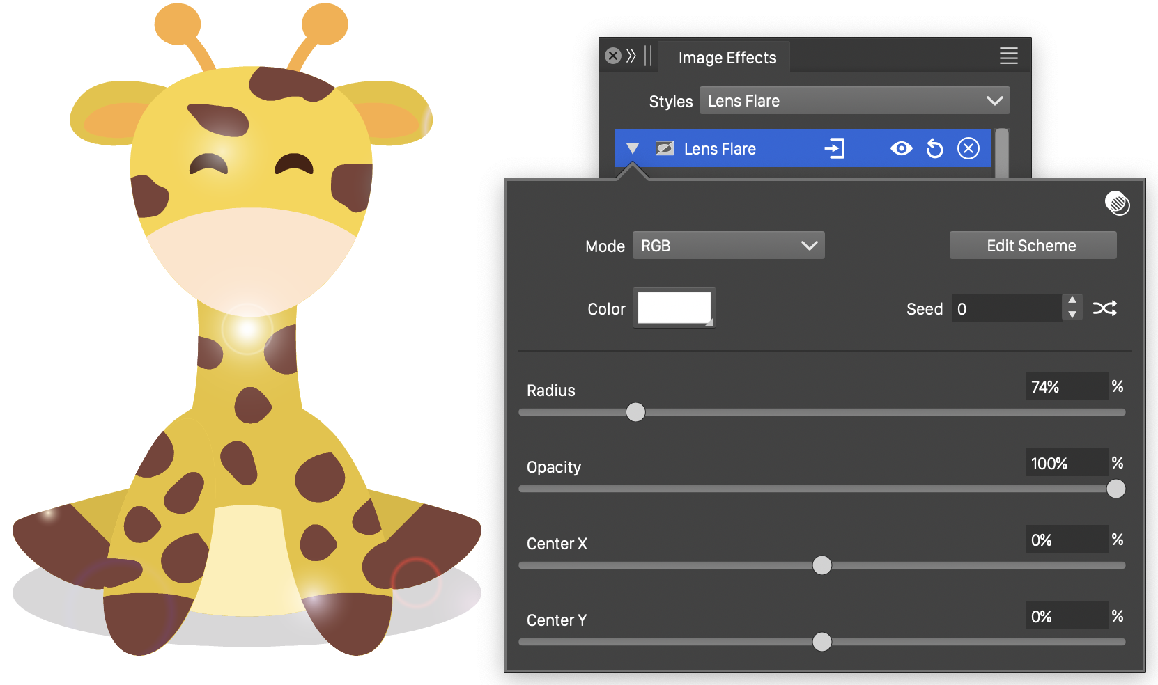 button can be used to pick random seed values. - Edit Scheme - Opens the lens flare scheme editor view to create custom lens flare effects.