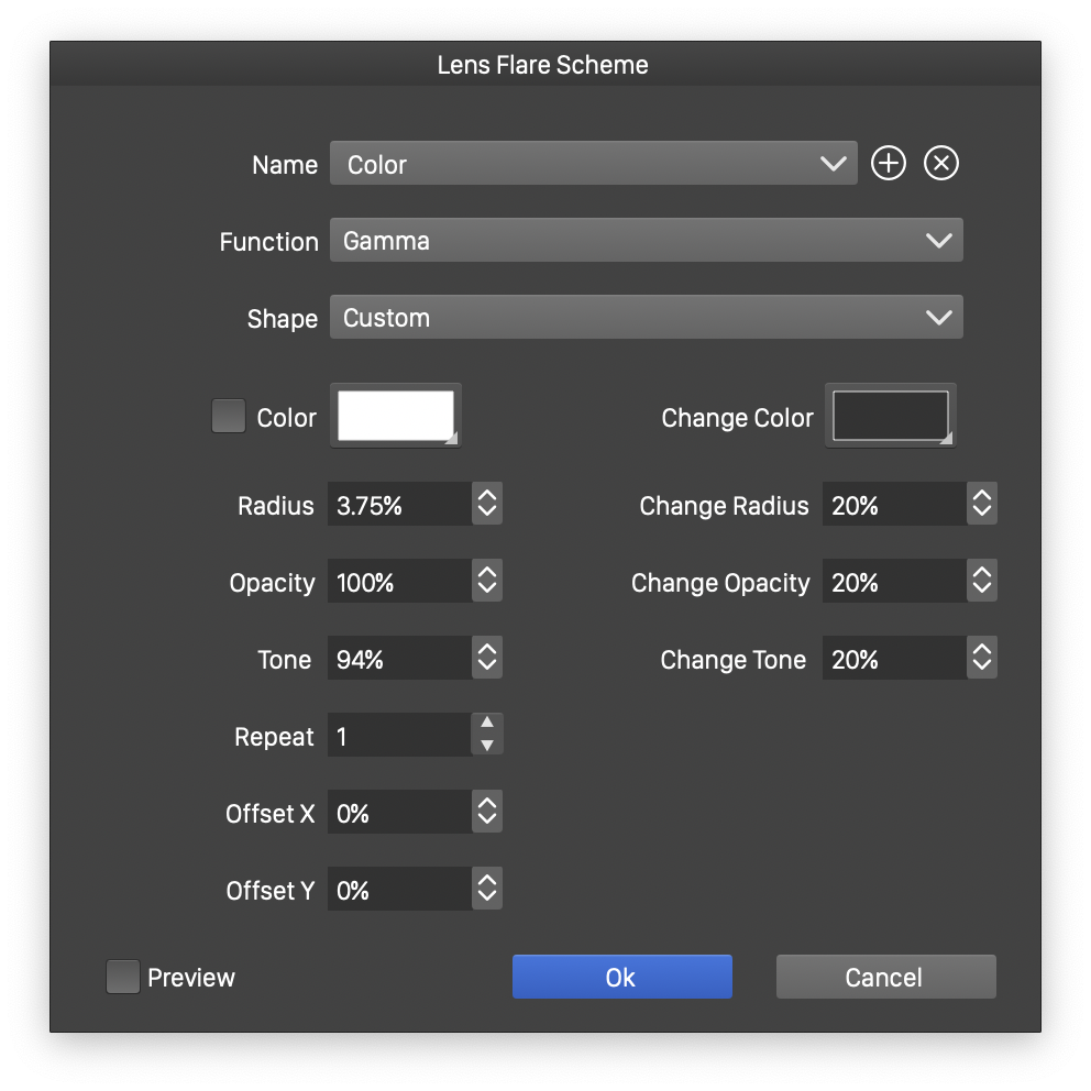 - Preview - Enable or disable the previewing of the current lens flare scheme options.