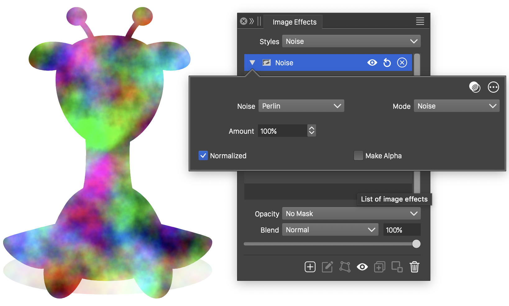 The Noise image generator effect, creates a synthetic noise and replaces the object image (and optionally the alpha channel) with the generated noise. The noise is synthesized from a user selected noise type, style or presets. Selecting and editing noise styles is described with more detail in the Noise chapter.