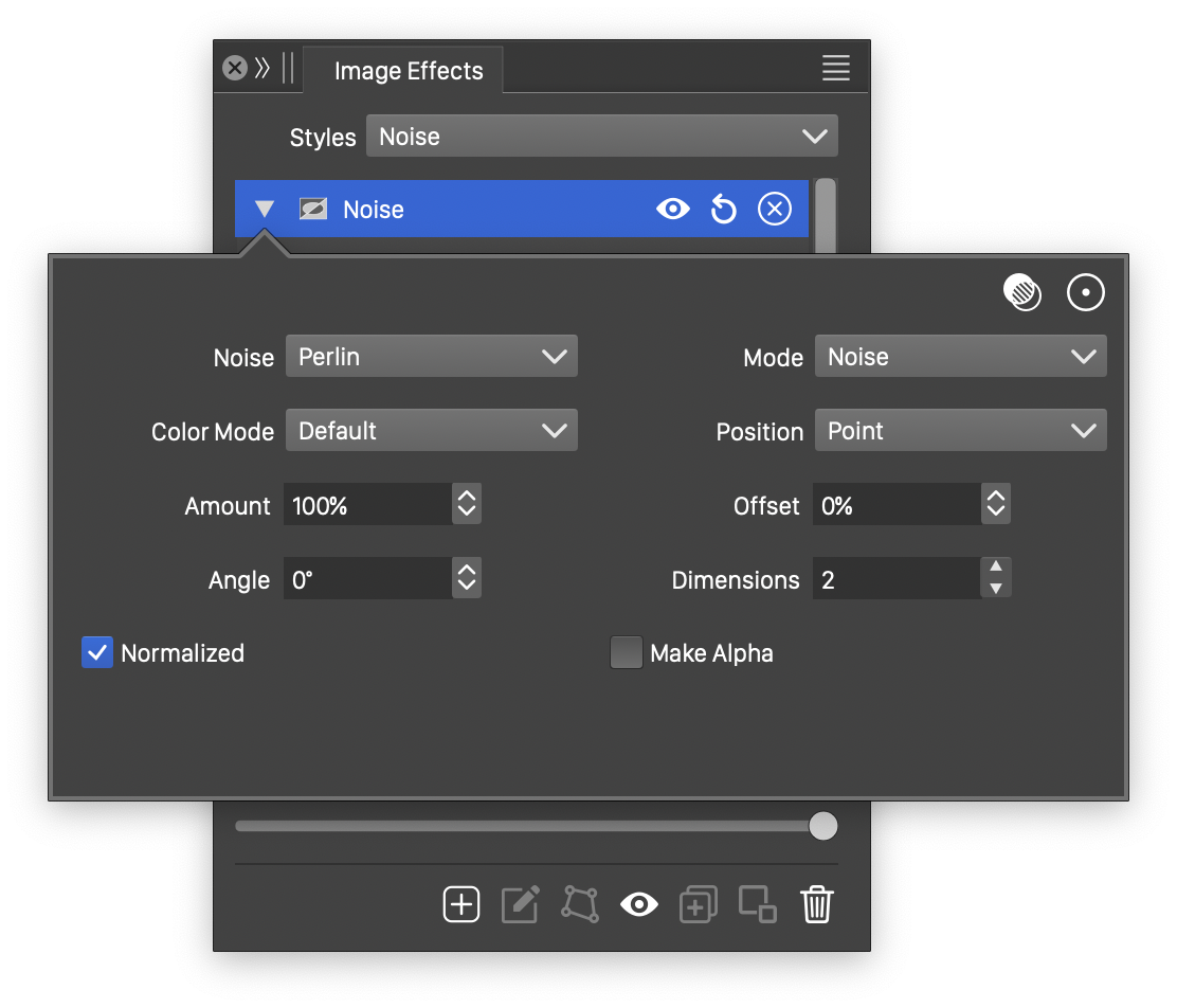 - Normalized - Enable or disable the generation of normalized noise. When normalized, noise intensities are adjusted based on the selected noise type, to limit the resulting color tone intensities.