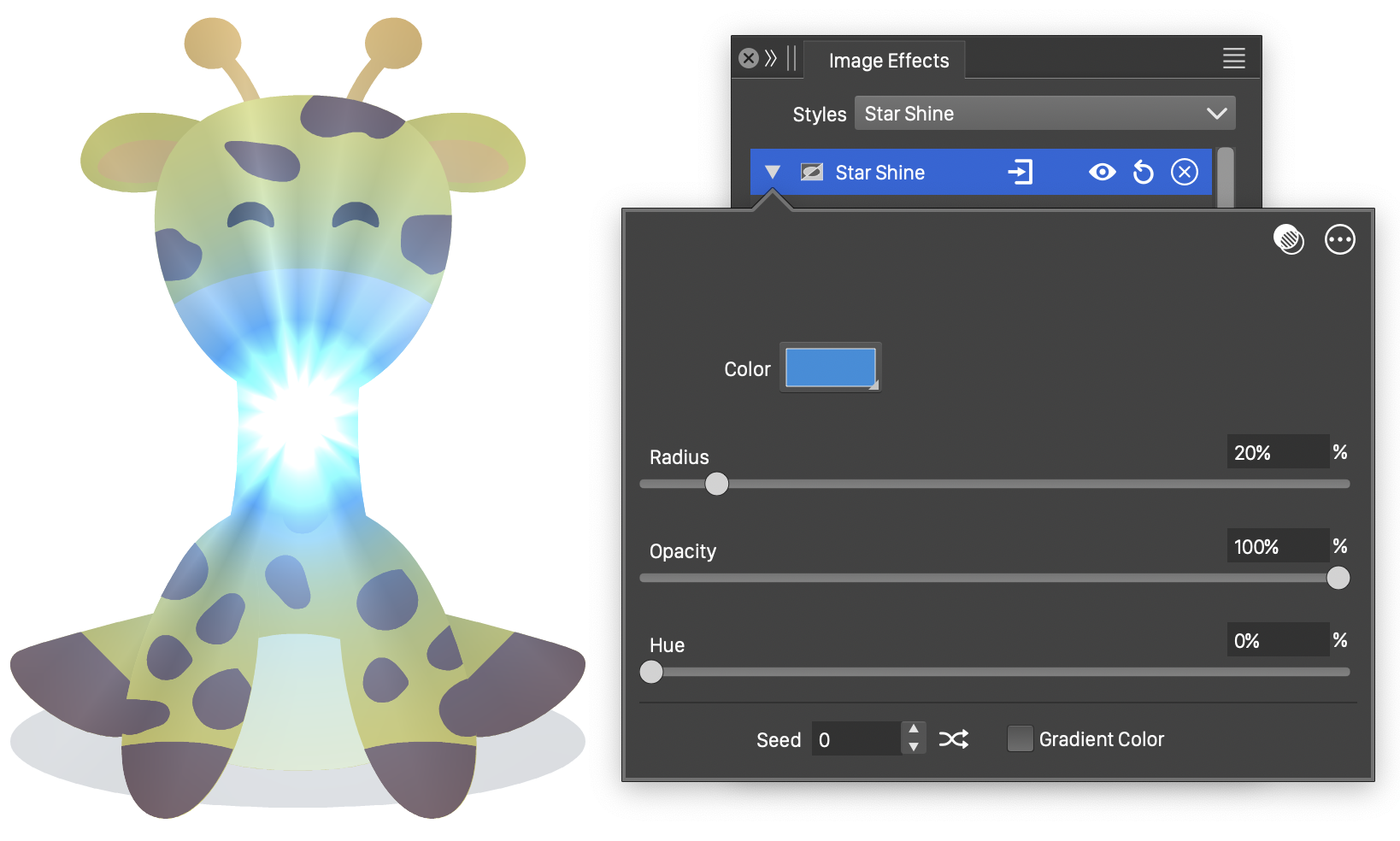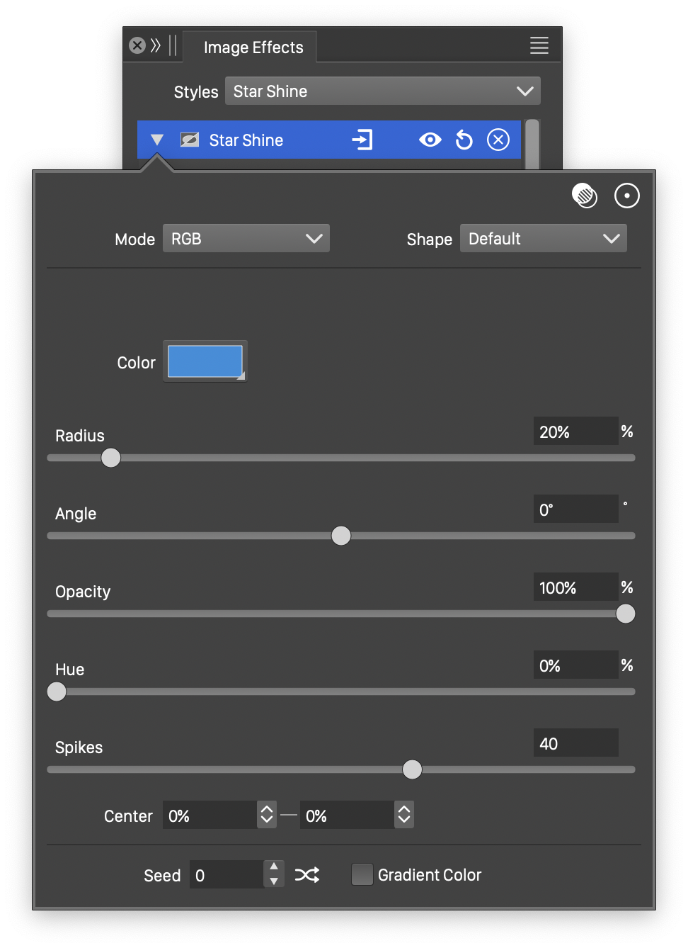 button can be used to pick random seed values. - Gradient Color - Enable or disable the use of a gradient color, to generate the star shine color intensities. When enabled, a Gradient field is shown and can be used to select a gradient color style or preset. The gradient can also be adjusted using the gradient slider. When disabled, the star shine color is set as a single color in the Color field.