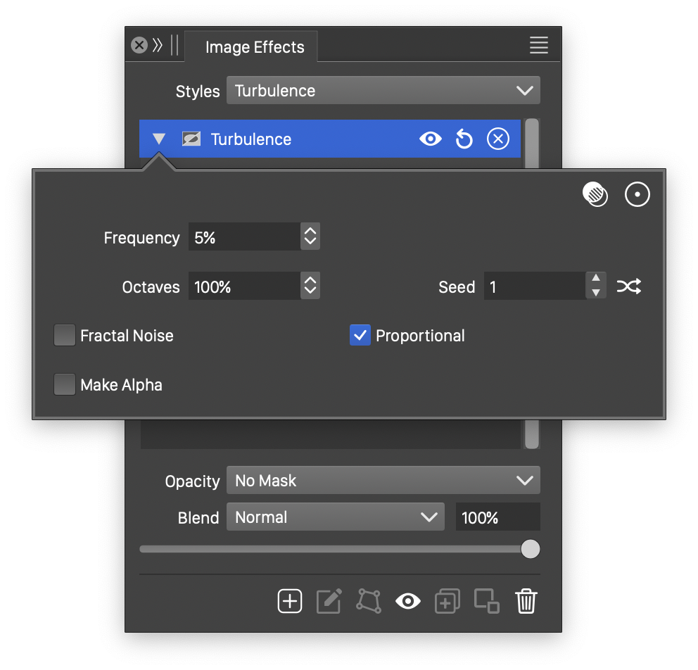 The Turbulence image generator effect, creates a synthetic noise using the SVG Turbulence effect. The SVG Turbulence effect is a special case of the Noise effect, and it can be created and adjusted separately, to allow exporting to SVG file format without generating an image.