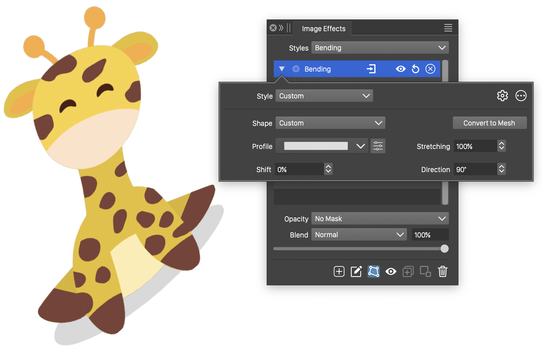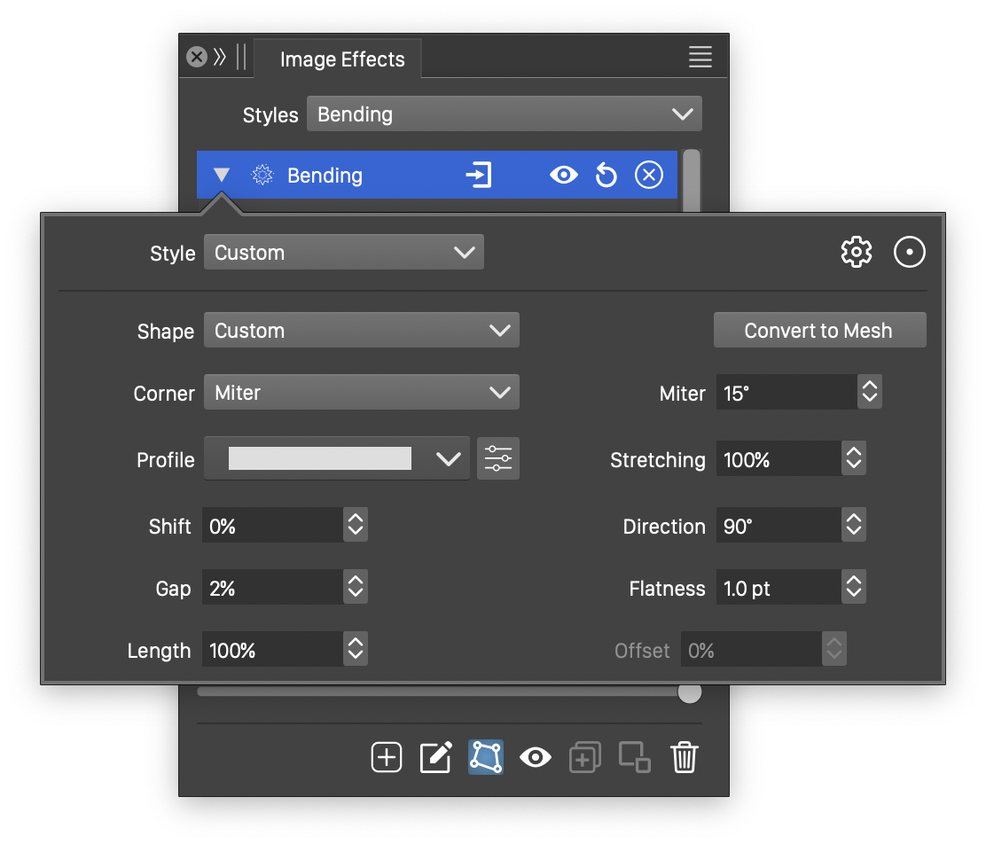 - Convert to Mesh - Convert the selected bending distortion into a mesh grid distortion effect.