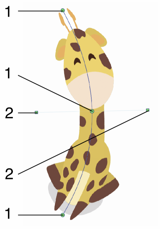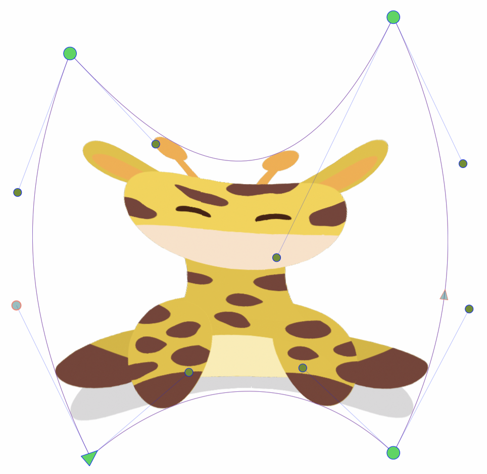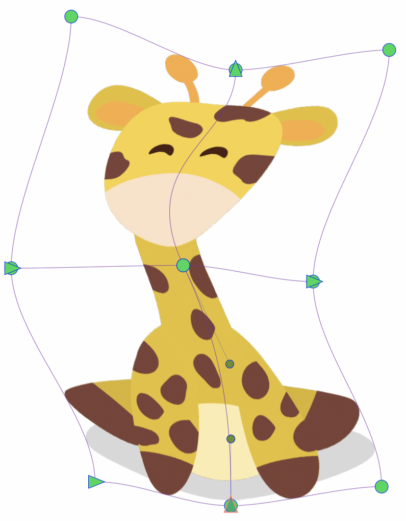 The mesh warp editing is done by adjusting the nodes and curves defining the mesh grid and edges. The mesh edges may contain any number of additional control points. The mesh nodes are indicated using larger node handles.