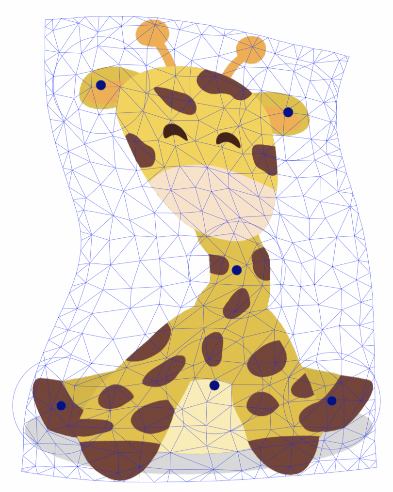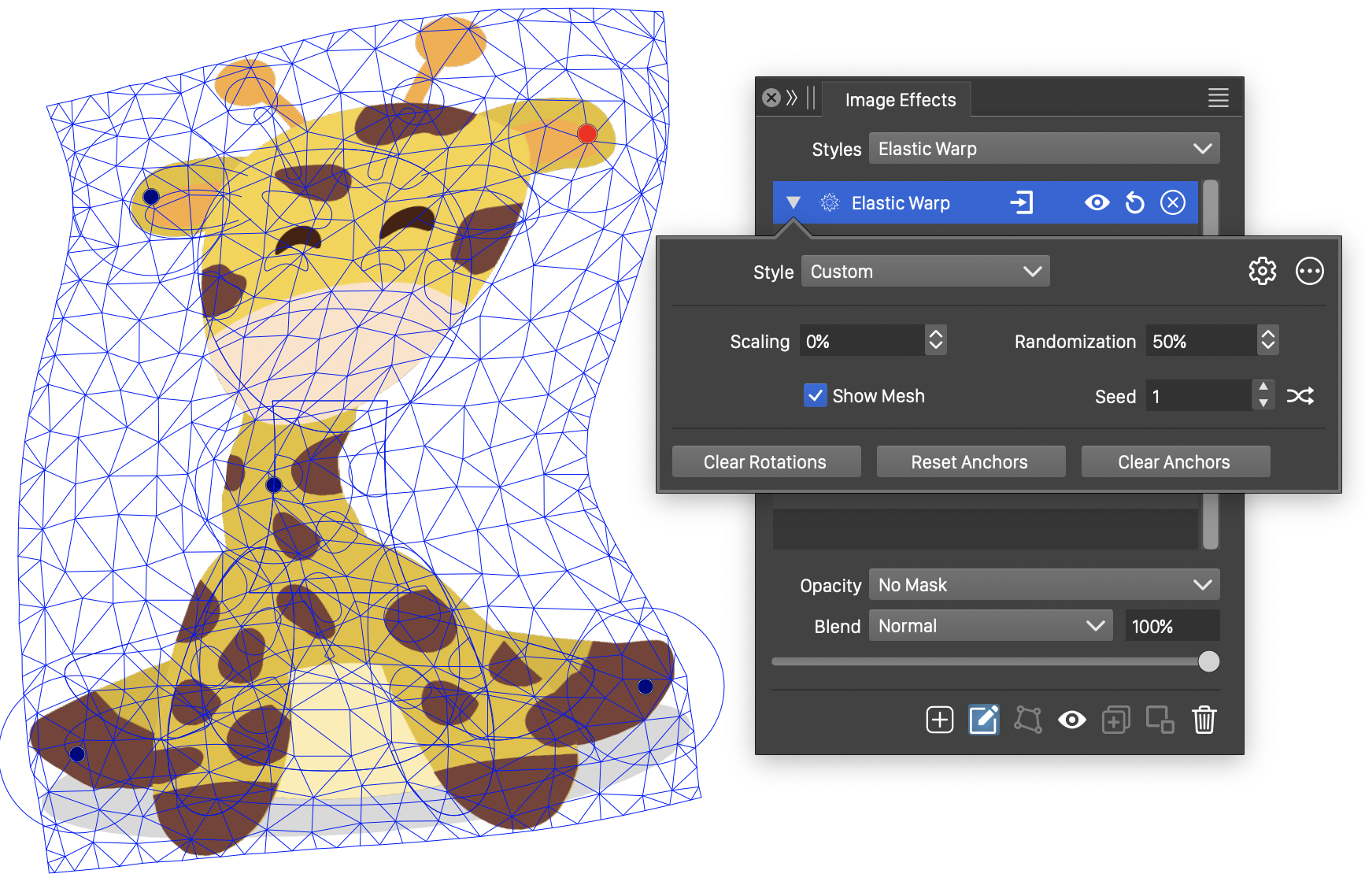 The Elastic Warp distortion stretches the image, of an object or group of objects, using an elastic mesh stretched at a number of user selected locations. The user selected anchor points of the mesh (also called pin-points) can be moved freely and the mesh stretches in an elastic way to move the underlying pixels to the location, while keeping other locations anchored.
