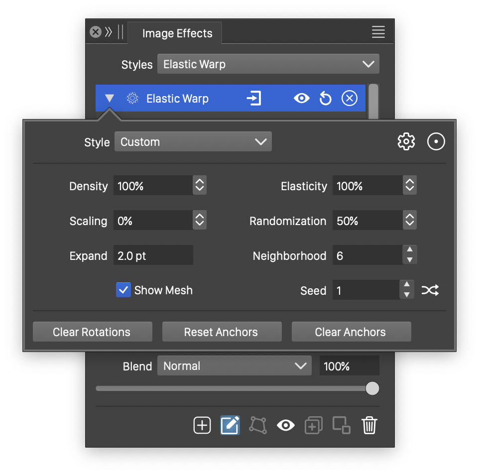 button from the Image Effects panel, activates the image effect tool used to interactively edit the elastic warp distortion anchor points.