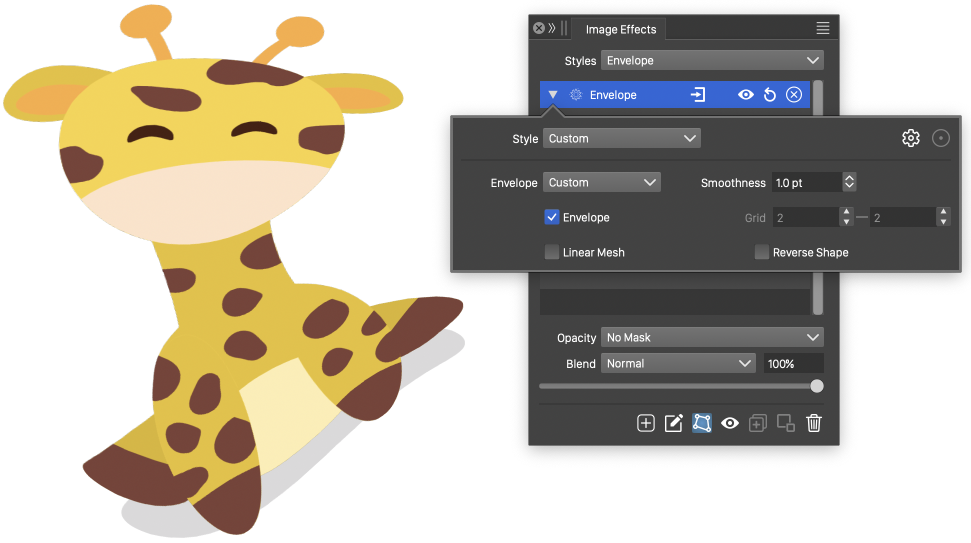 The envelope and mesh grid shapes can be interactively edited as a regular closed shape or path, using the primary image effect editor
