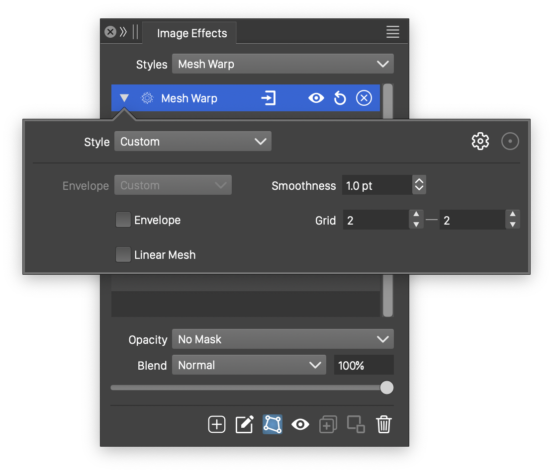 The Envelope and Mesh Warp distortion effects use the following options: