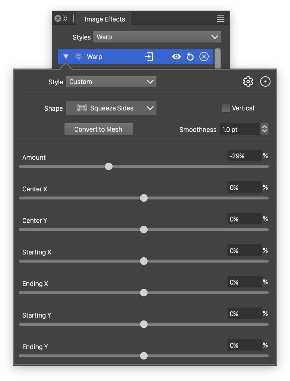 - Convert to Mesh - Converts the warp distortion into an editable mesh distortion.