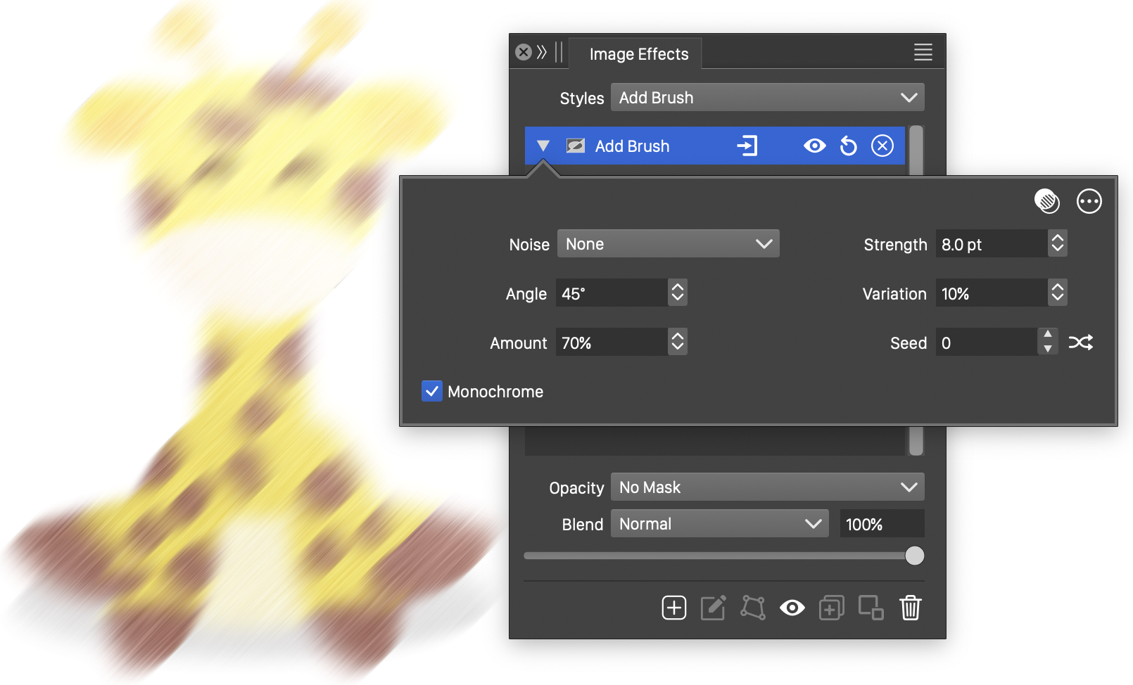 button can be used to pick random seed values. - Monochrome - Enable or disable monochrome adjustments to the brushing effect color. When enabled, the add brush effect results in tonal adjustments of the original colors. When disabled, each color channel will be adjusted by separate brush tracks.