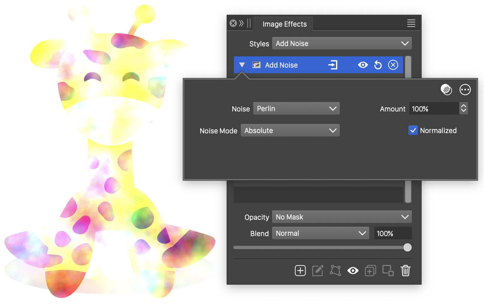 - Absolute - Adjust the color components by absolute amounts generated by the noise.