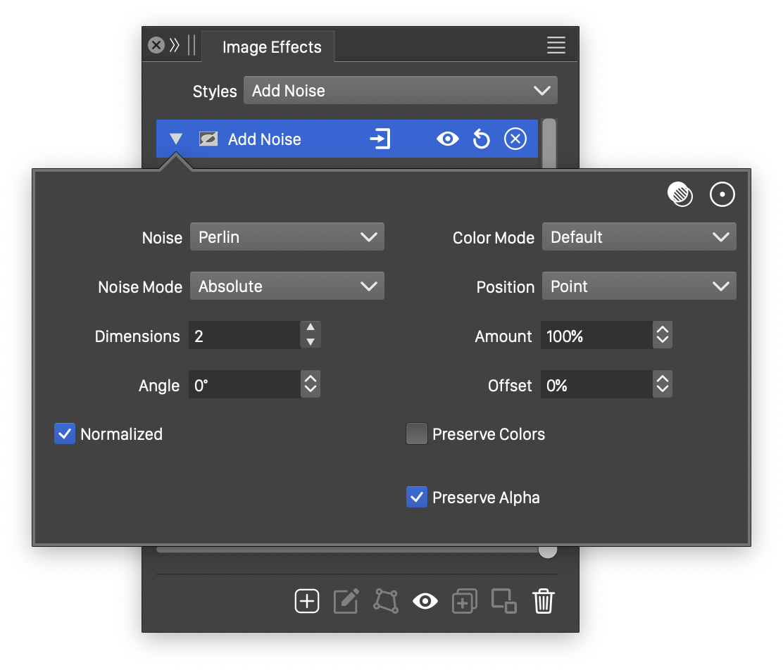The Add Noise generator effect uses the following basic options: