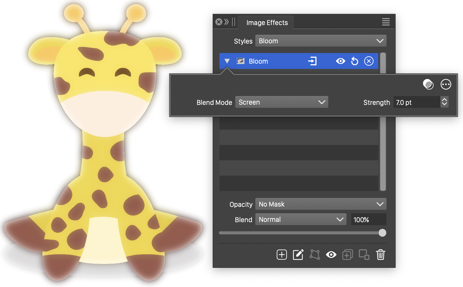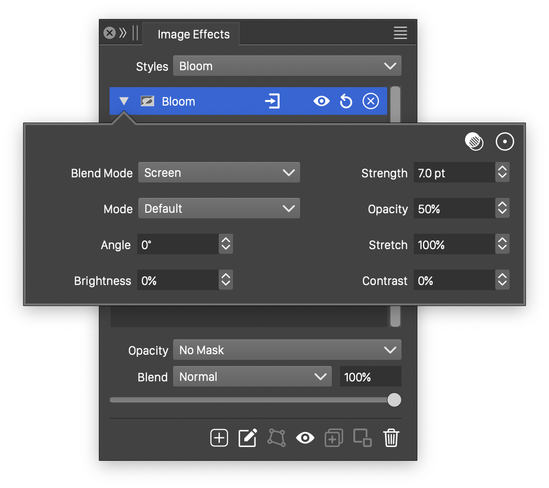 button from the Image Effects panel, activates the image effect tool used to interactively edit the bloom effect attributes.