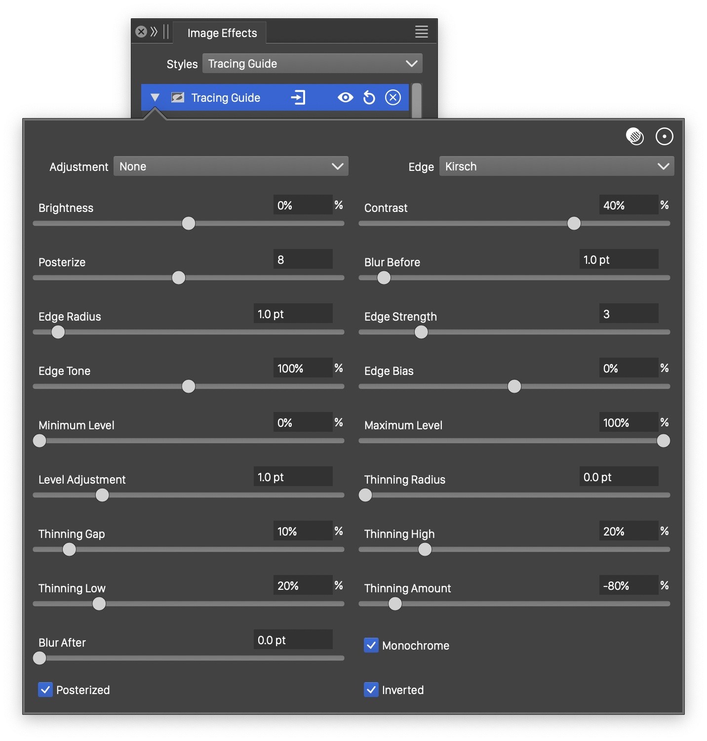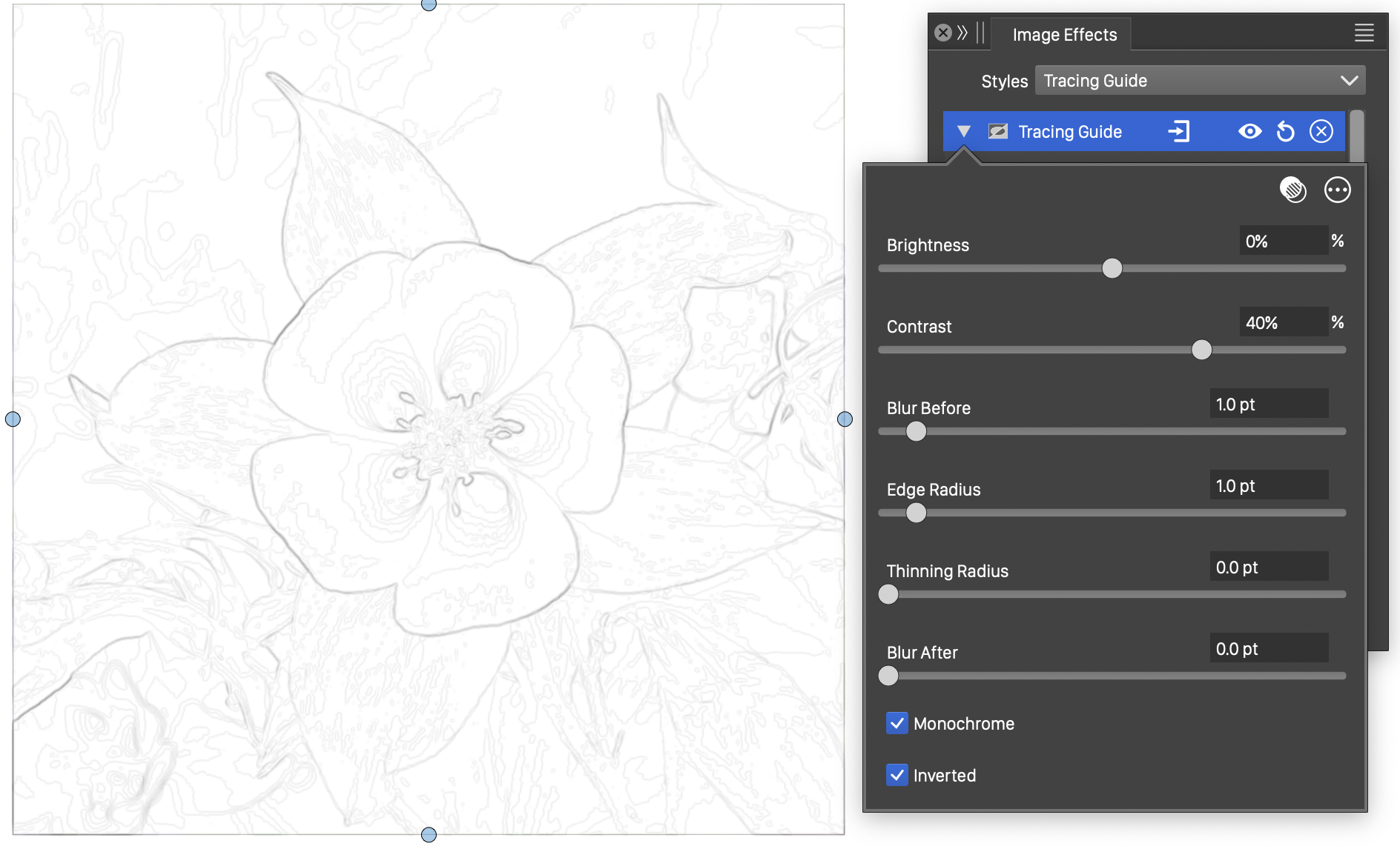 The Tracing Guide stylistic effect highlights the strong edges of the image, to enable automatic curve extraction. The manual image trace tool uses this image effect to extract edges from the image and create smooth curves approximating these edges. For more details, see the Tracing Guide panel and the manual image trace tool.