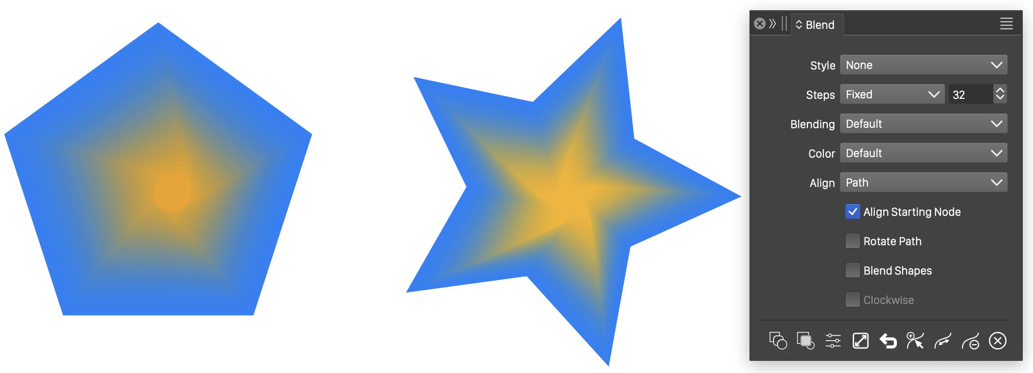 Blended shapes are shapes created from a single step blend of two other shapes. Blended shapes can link to existing object shapes or shape styles. The blending position of a blended shape can be adjusted in the Shape panel.