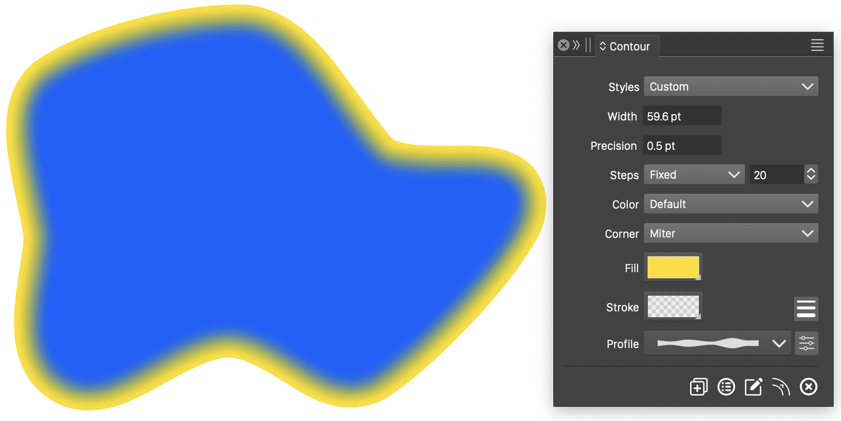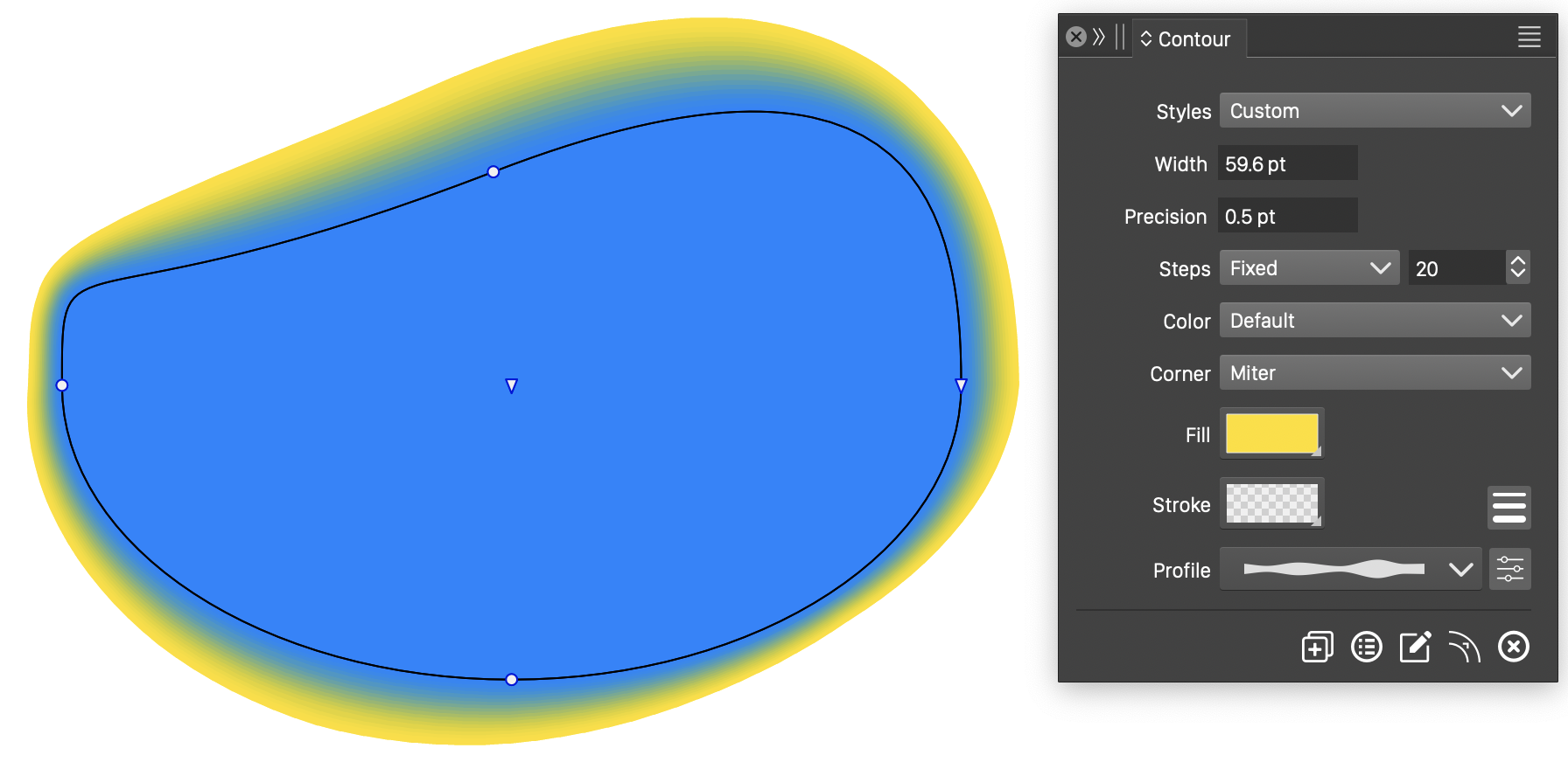 In this example, a contour is created around a closed shape. The shape is filled with a solid blue color, and the contour fill color is selected to a yellow color. This results in a set of filled overlapping shapes.