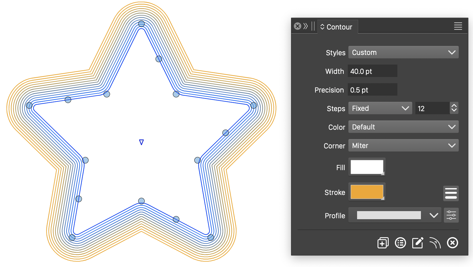 The Contour effect creates multiple contours around an object at varying distances using a transition to a selected style. The contour effect can be used to create parallel shapes, or to expand an object with an outline shade. The distance or width of the contour can be set to a variable width profile, and interactively edited with the Contour