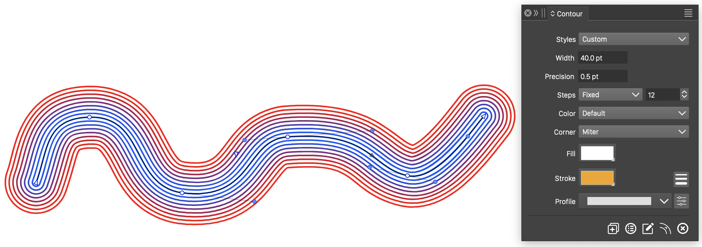 In this example, the contour is created around an open path. The open path has a stroke style, and the contour will consist of outlines at varying distance around the original outline.