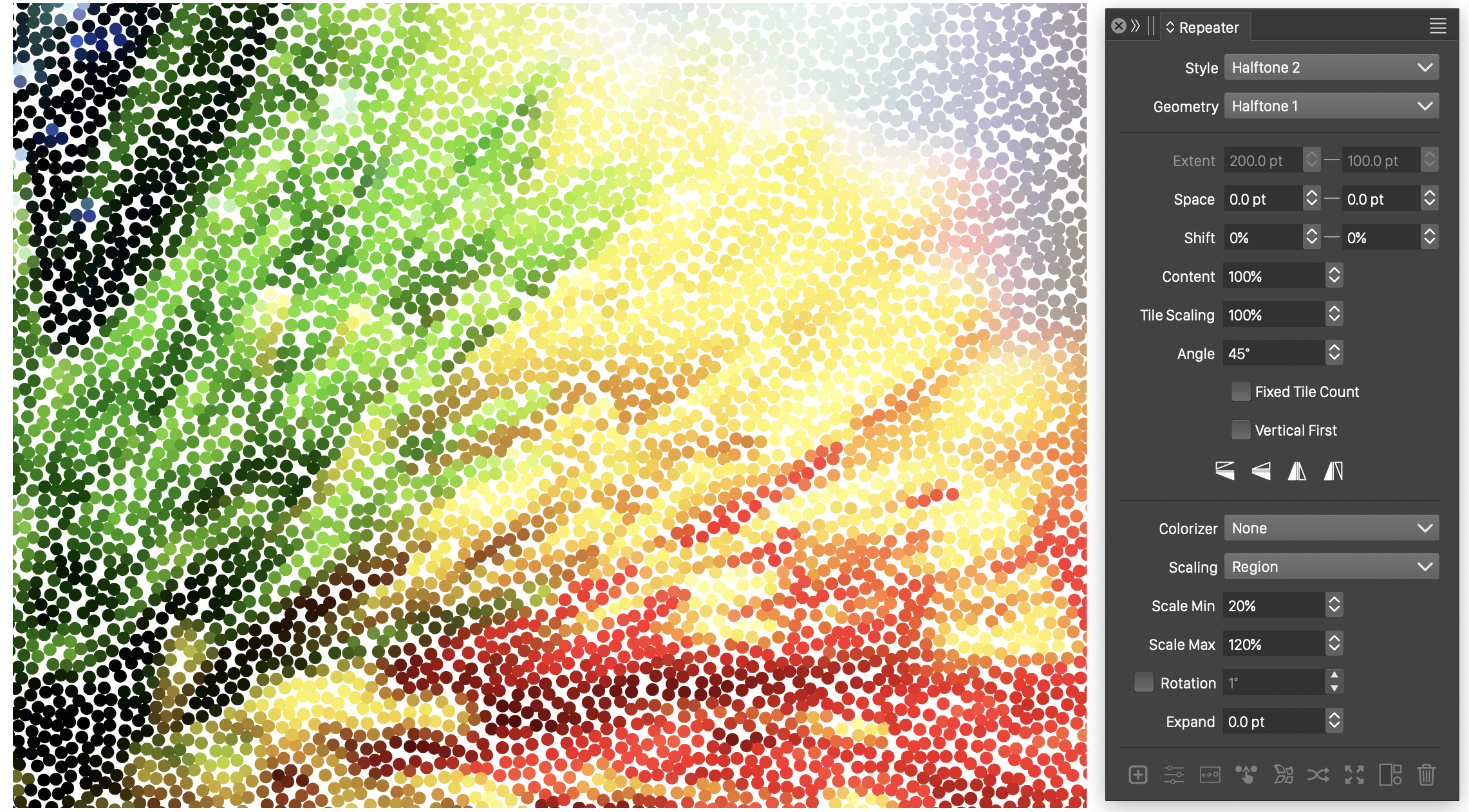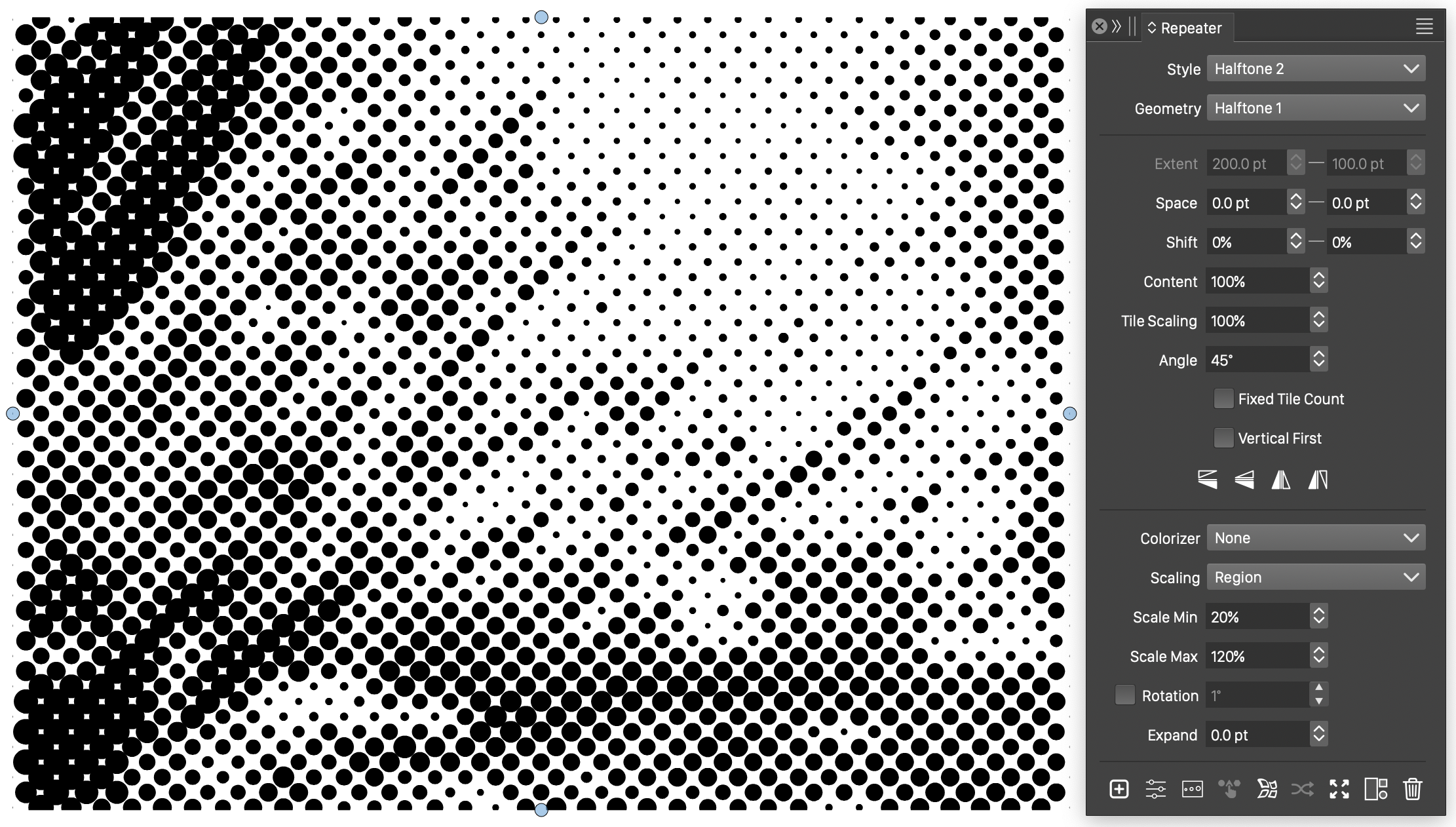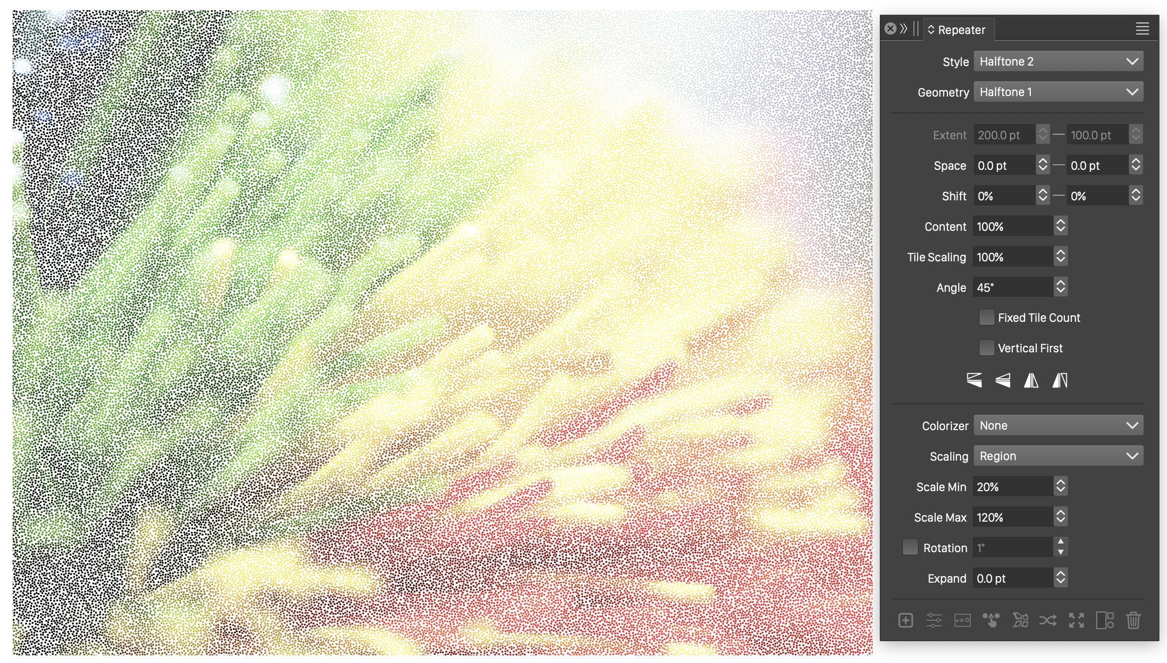 Repeaters can be used to achieve various vector effects like halftones, space fill or stippling. These effects can be achieved by a combination of geometry, colorization, and adjustment options available for a repeater.