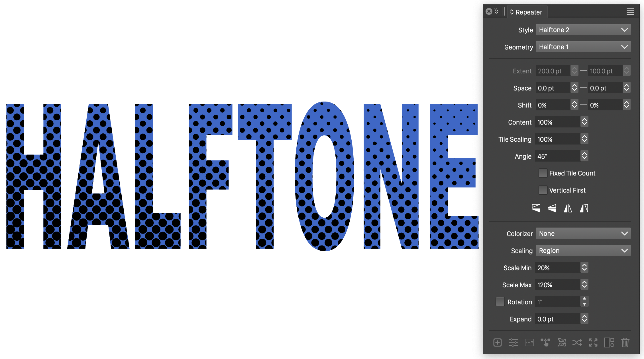 In this example, a repeater is used to add a custom vector halftone to a text shape. The text remains editable, and the halftone is updated as the text changes. The halftone approximates a gradient at 45 degrees, and it is independent of the text fill style.