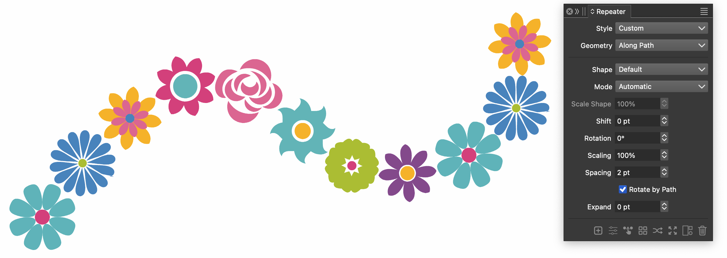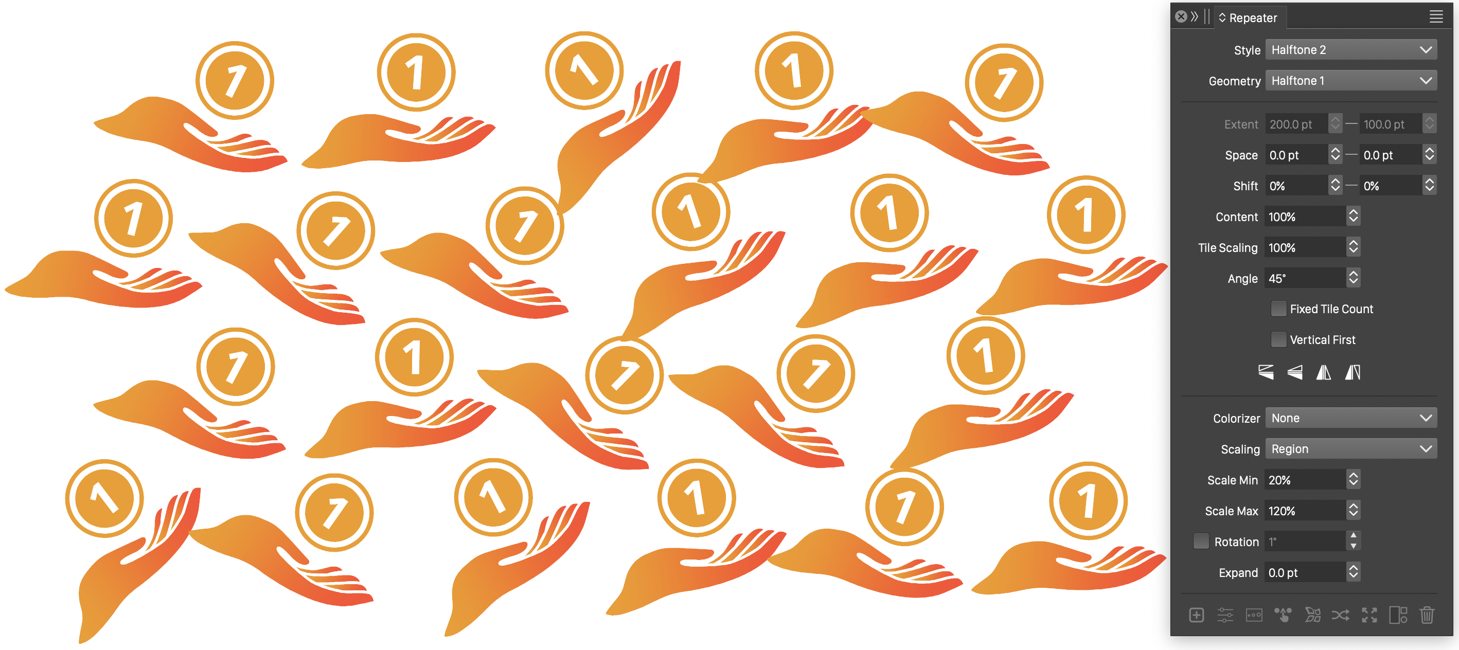 Repeaters can be used to create automatic copies of objects or symbols, to fill regions with copies of objects (space fill), or to create vector halftones. The content of a repeater will remain editable vector objects, and the repeater options can be adjusted to achieve the desired effect. Repeaters can be expanded, to access the resulting object copies.
