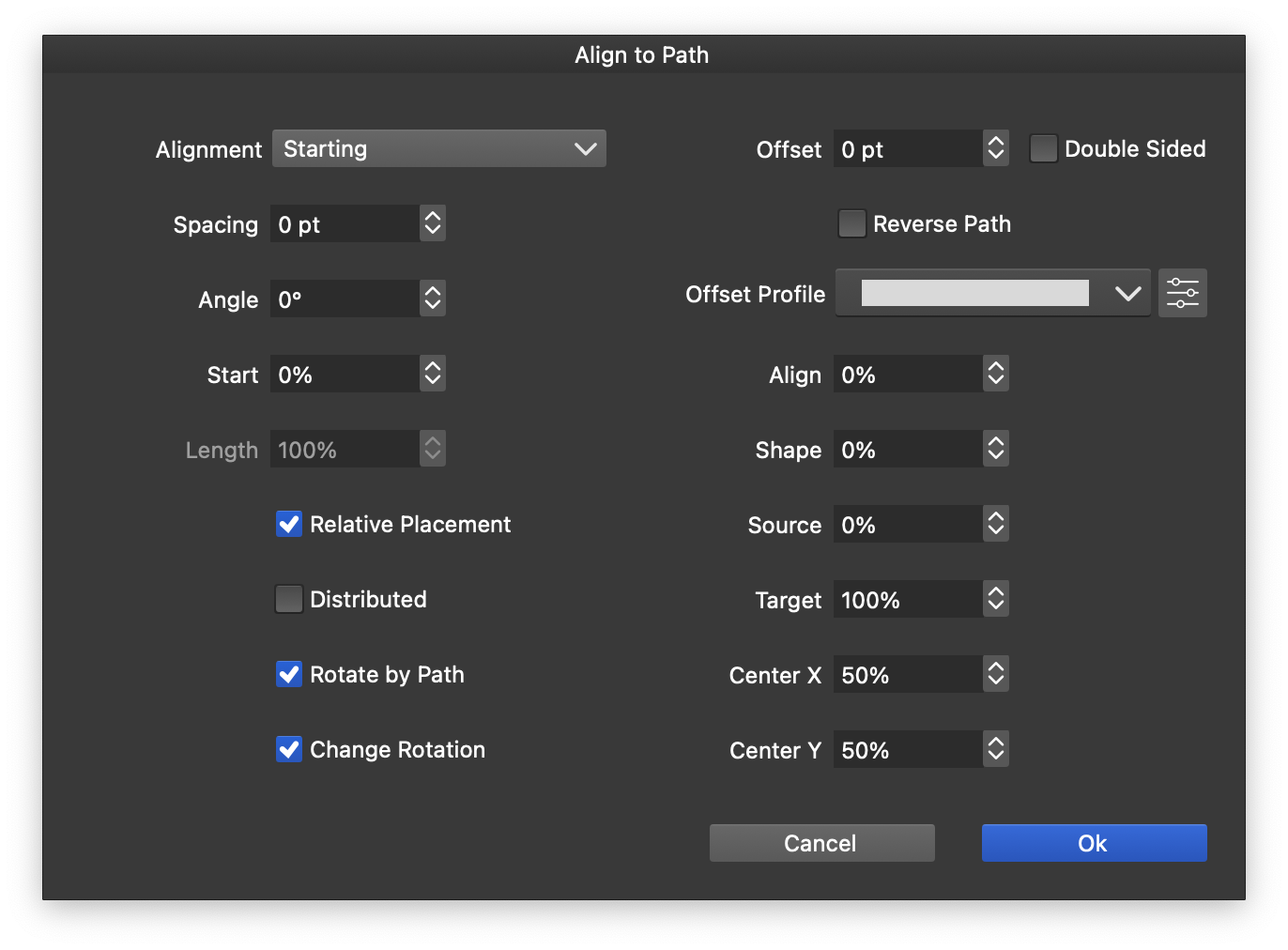- Relative Placement - Check to set the Start and Length fields relative to the path length. Otherwise, these are set in absolute values.
