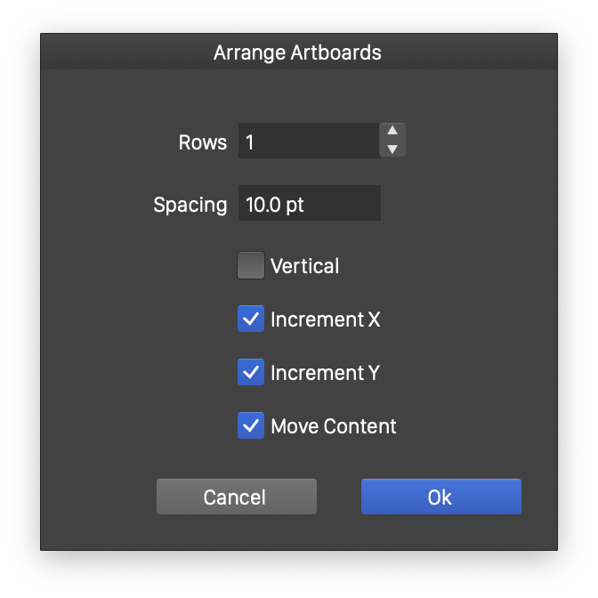 - Increment X - Arrange artboards in increasing or decreasing order of their horizontal positions.