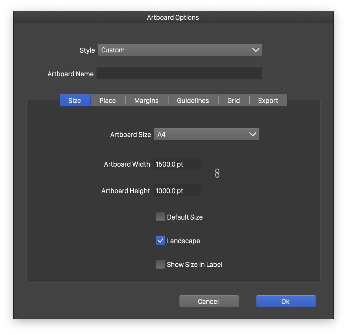 - Default Size - Enable or disable the use of the default artboard size from the document setup.