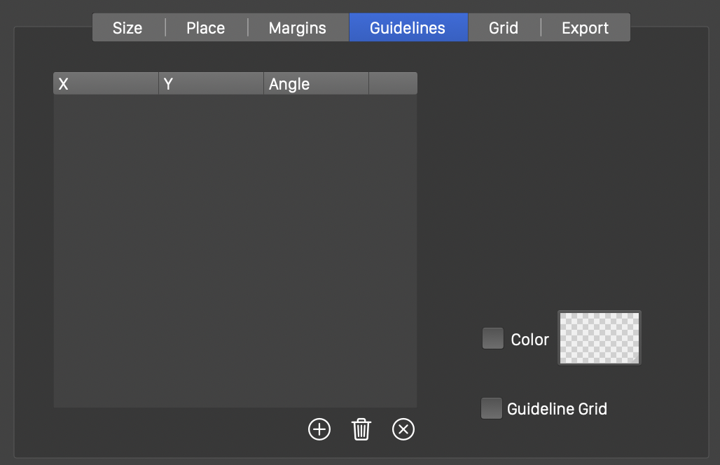 - The guidelines are shown in the list, containing the X and Y positions of the guidelines and their angles.