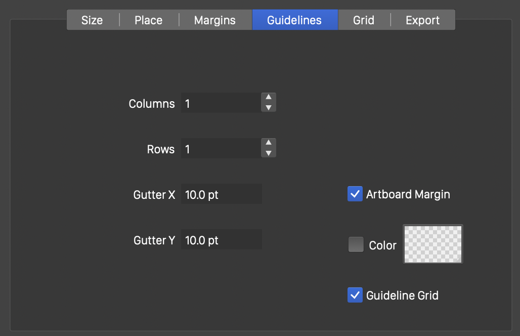 - Color - Select a color used for the artboard guideline. Each artboard can have its own guideline color.