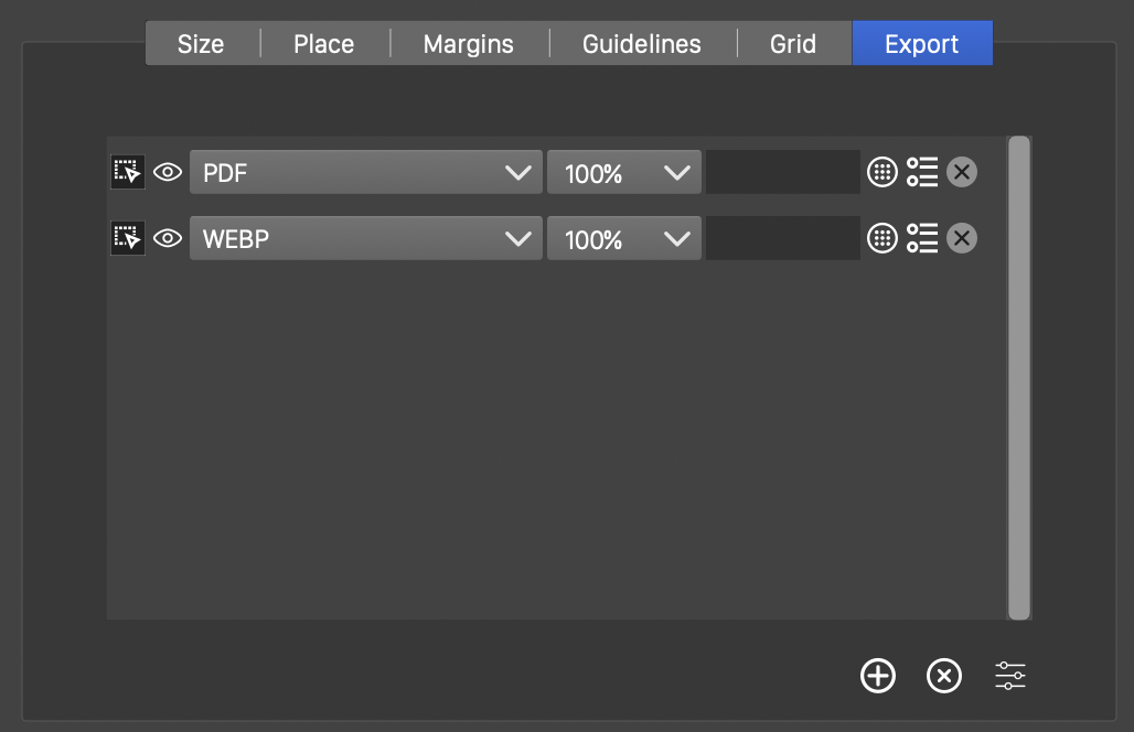 Each artboard may contain a set of exporting options, used to create a synthetic slice associated with the area. The editing of an export slice is described in the Export Slices section.