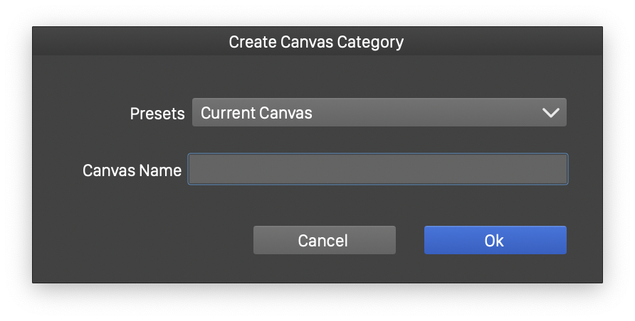 To create a new canvas category, select the Create Canvas Category command of the Canvas menu.