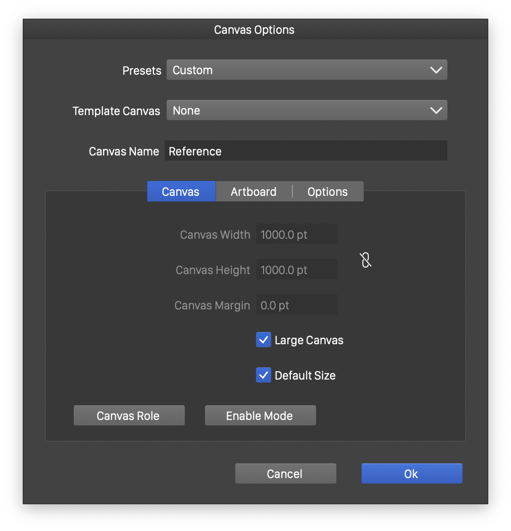 - When creating a new Reference canvas, the Canvas Role option is shown, to set the role of the objects in the reference canvas.