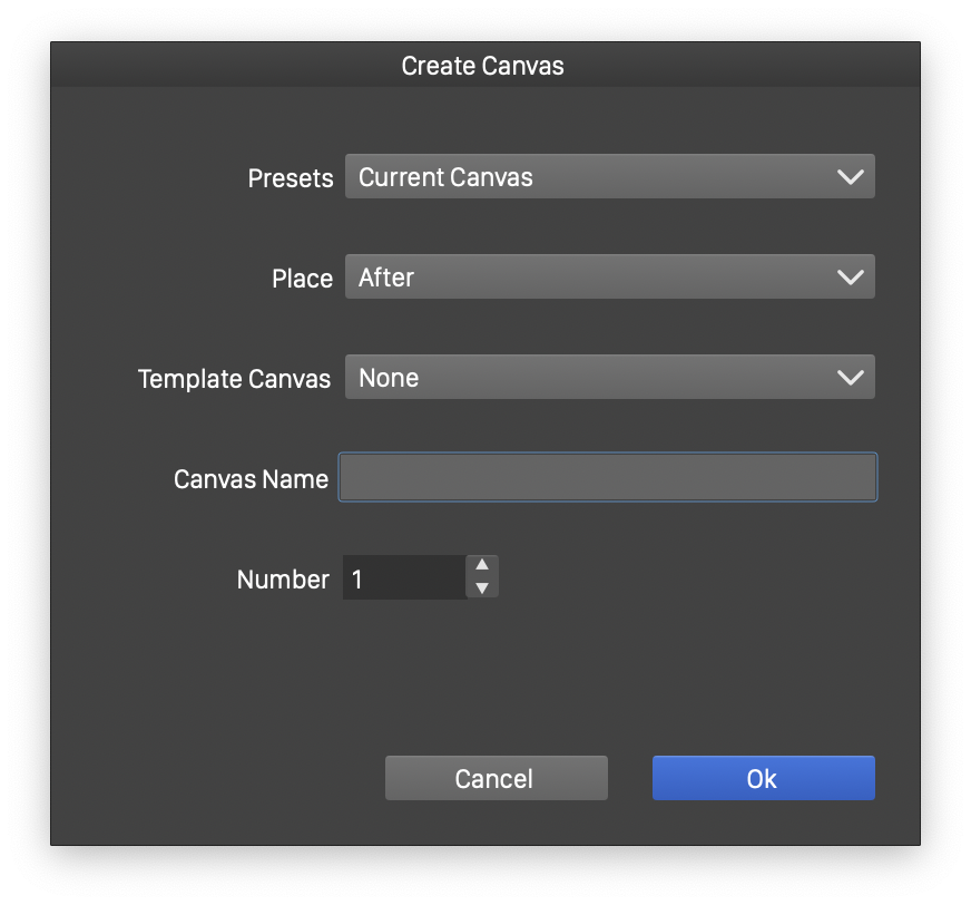 - Canvas Name - Edit the name of the new canvas, used to identify the canvas in the Canvas & Artboard panel.
