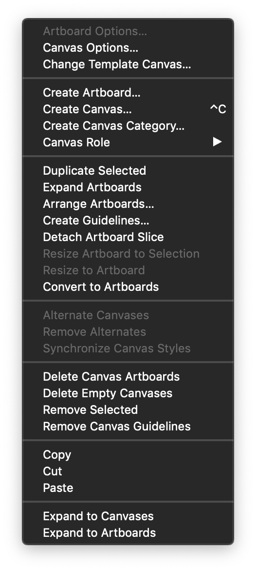- Copy - Copies the selected canvas and artboard into an internal panel clipboard.