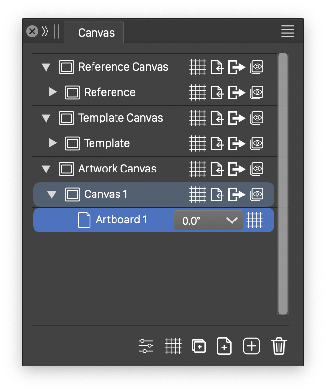 The Canvas & Artboard panel is used to manage the hierarchy of canvases in the current document, and the list of artboards associated with each canvas.