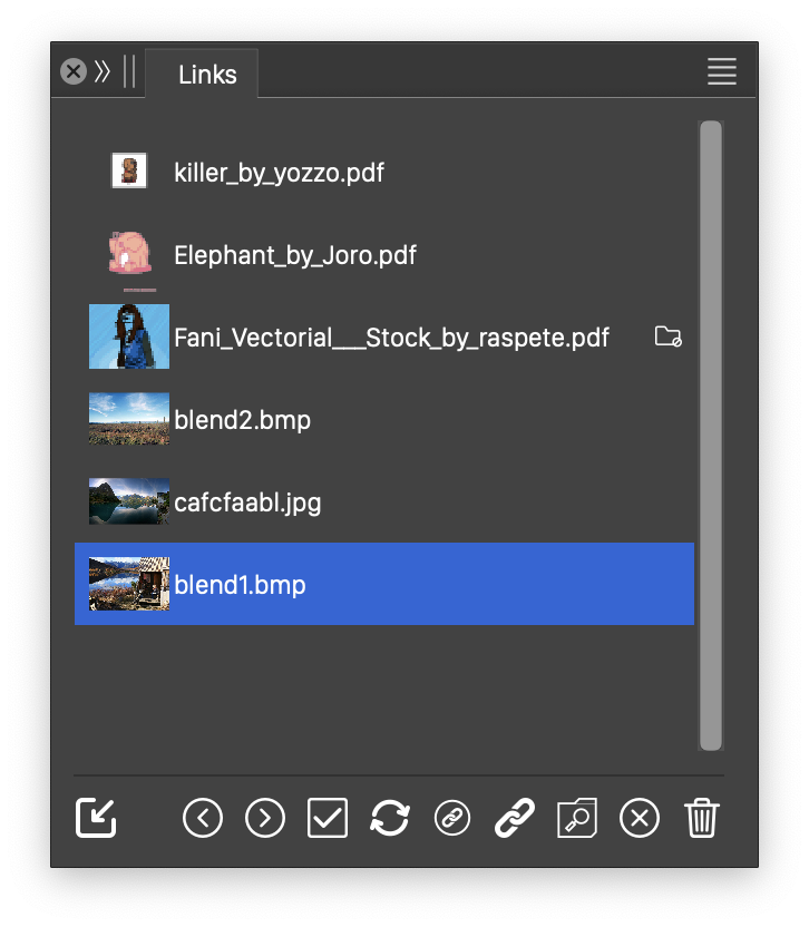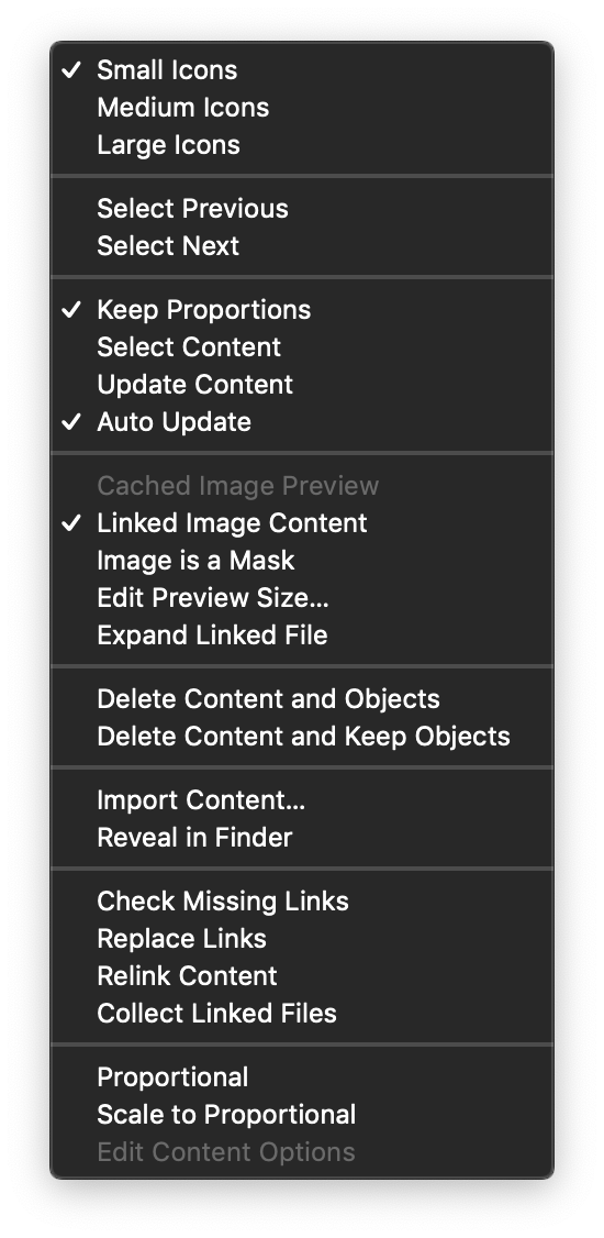 The Links panel menu provides the following commands and options to manage the linked image, vector and text content of the current document: