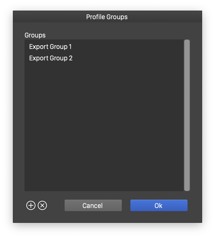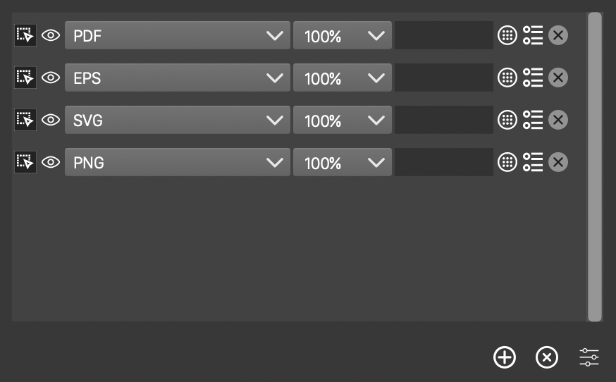 The list of export options of an export profile is edited in the same way as in the Slices panel. The export format list can also appear when batch exporting artboards or objects, or in the Object Export panel.